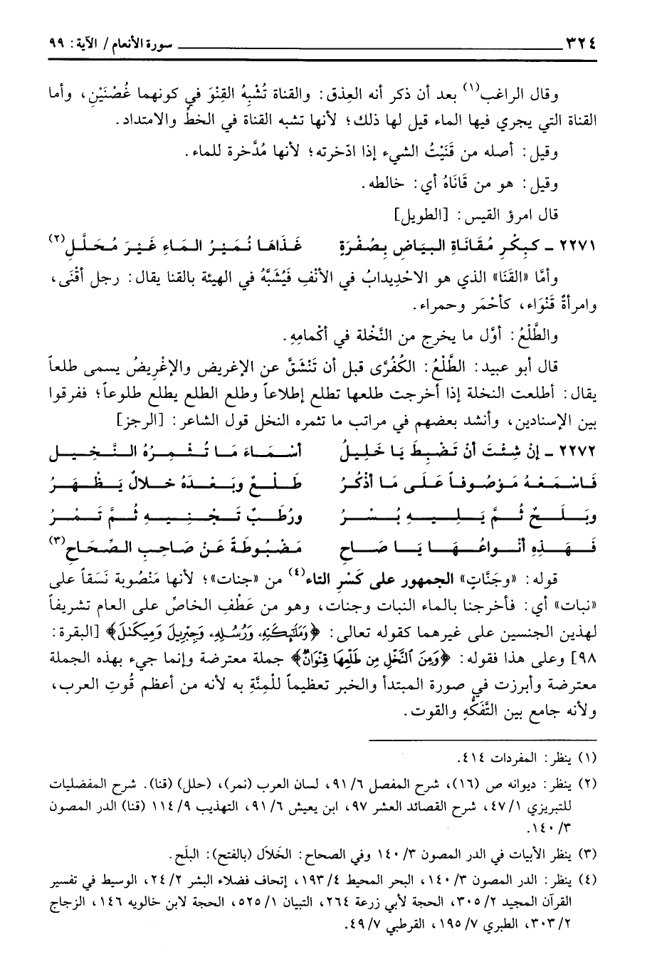 قوله: «وجَنَّاتٍ» الجمهور على كَسْرِ التاء من «جنات» ؛ لأنها مَنْصُوبة نَسَقاً على «نبات» أي: فأخرجنا بلاماء النبات وجنات، وهو من عَطْفِ الخاصِّ على العام تشريفاً لهذين الجنسين على غيرهما كقوله تعالى: {وملاائكته وَرُسُلِهِ وَجِبْرِيلَ وَمِيكَالَ} [البقرة: 98] وعلى هذا فقوله: {وَمِنَ النخل مِن طَلْعِهَا قِنْوَانٌ} جملة معترضة وإنما جيئ بهذه الجملة معترضة وأبرزت في صورة المبتدأ والخبر تعظيماً للْمنَّةِ به لأنه من أعظم قُوتِ العرب، ولأنه جامع بين التَّفَكُّهِ والقوت.