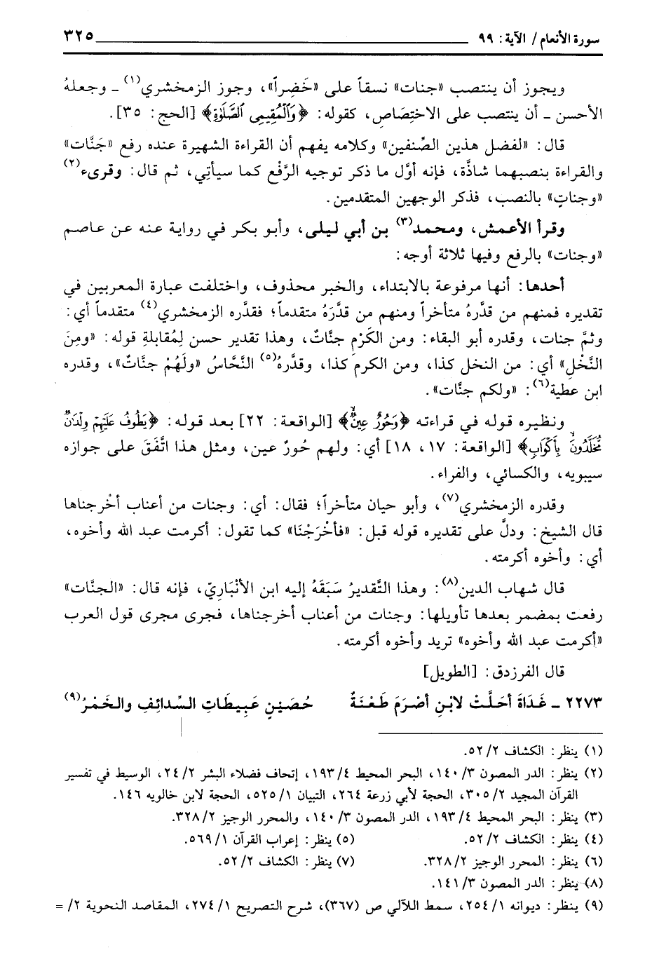 قال: «لفضل هذين الصِّنفين» وكلامه يفهم أن القراءة الشهيرة عنده رفع «جَنَّات» والقراءة بنصبهما شاذَّة، فإنه أوَّل ما ذكر توجيه الرَّفْع كما سياتي، ثم قال: وقرئ «وجنات» بالرفع وفيها ثلاثة أوجه: