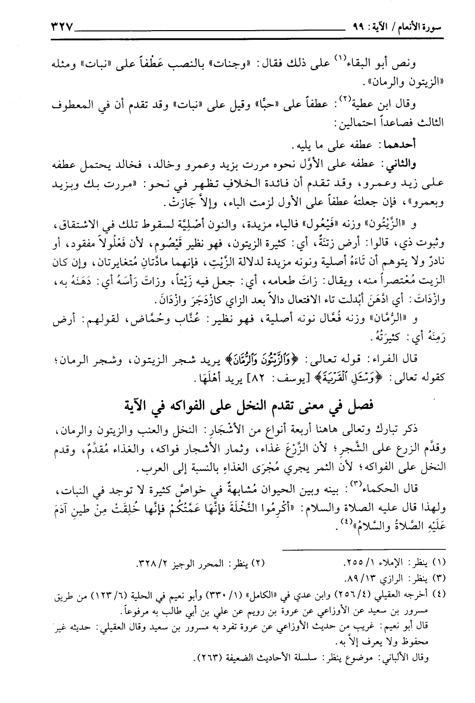 ونص أبو البقاء على ذلك فقال: «وجنات» بالنصب عَطْفاً على «نبات» ومثله «الزيتون والرمان» .