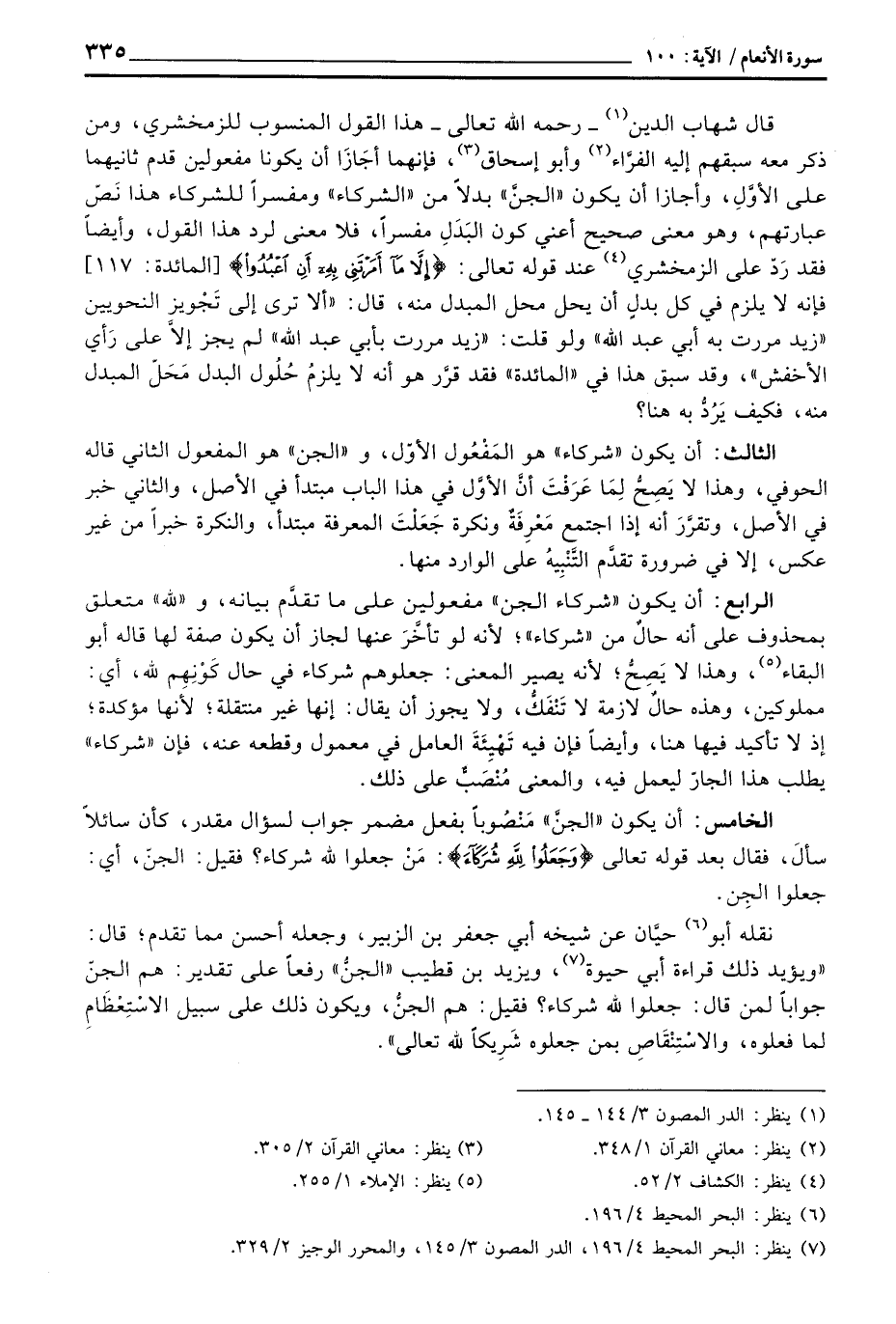 قال شهاب الدين: رَحِمَهُ اللَّهُ تعالى - هذا القول المنسوب للزمخشري، ومن ذكر معه سبقهم إليه الفرَّاء وأبو إسحاق، فإنهما أجَاظَ أن يكونا مفعولين قدم ثانيهما على الأوَّلِن وأجازظا أن يكون» الجنَّ «بدلاً من» الشركاء «ومفسراً للشركاء هذا نَصّ عبارتهم، وهو معنى صحيح أعني كون البَدَلِ مفسراً، فلا معنى رد هذا القول، وأيضاً فقد رَدّ على الزمخشري عند قوله تعالى: {إِلاَّ مَآ أَمَرْتَنِي بِهِ أَنِ اعبدوا} [المائدة: 117] فإنه لا يلزم في كل بدلٍ أن يحل محل المبدل منه، قال:» ألا ترى إلى تَجْويز النحويين «زيدت مررت به أبي عبد الله» ولو قلت: «زيدت مررت بأبي عبد الله» لم يجز إلاَّ على رَأي الأخفش «، وقد سبق هذا في» المائدة «فقد قرَّر هو أنه لا يلزمُ حُلُول البدل مَحَلّ المبدل منه، فكيف يَرُدُّ به هنا؟