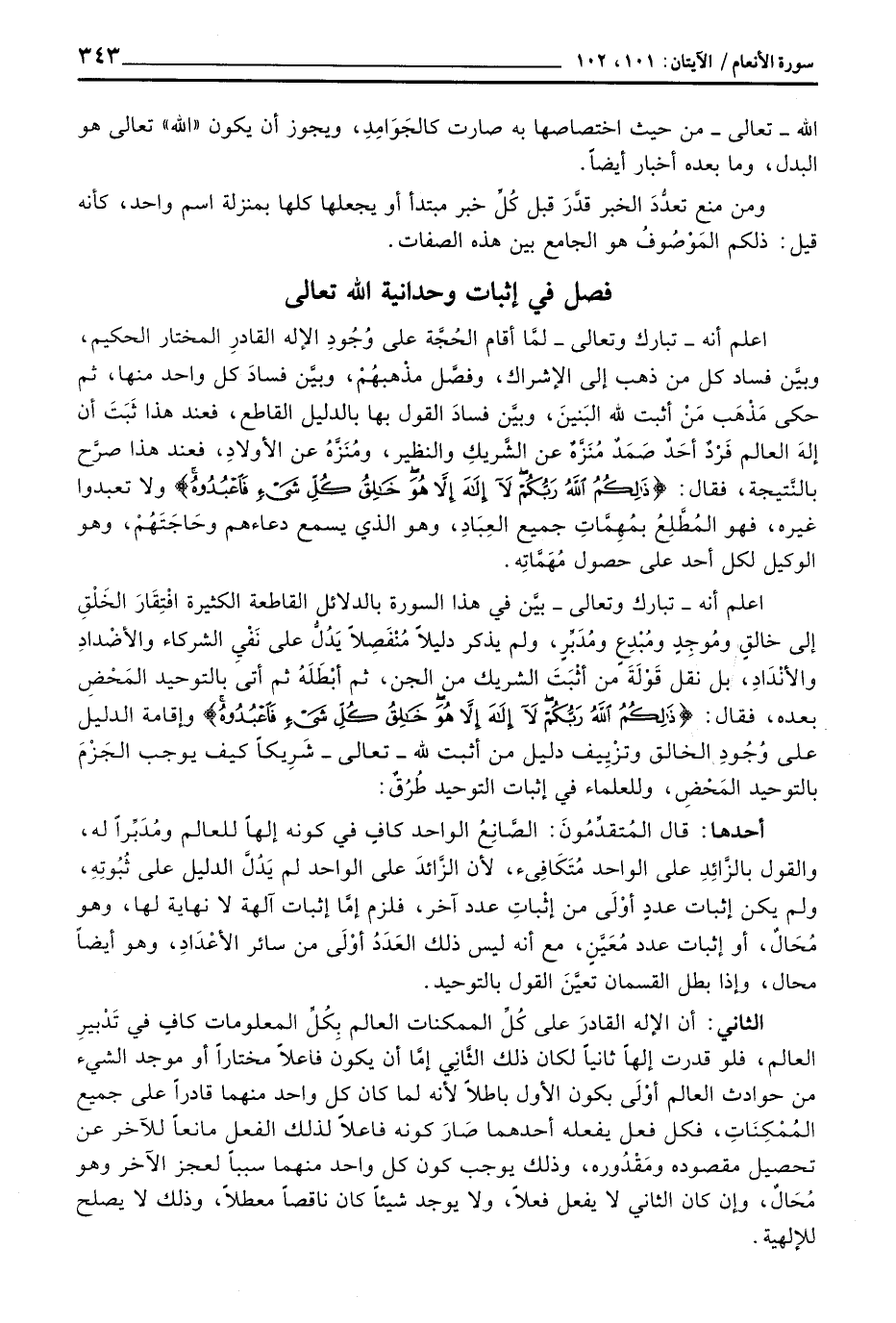 أعلم أنه - تبارك وتعالى - بيَّن في هذا السورة بالدلائل القاطعة الكثيرة افْتِقَارَ الخَلْقِ إلى خالقٍ ومُوجِدٍ ومُبْدِعٍ ومُدَبِّرٍٍ، ولم يذكر دليلاً مُنْفَصِلاً يَدُلُّ على نَفْي الشركاء والأضْدادِ والأنْدَادِ، بل نقل قَوْلَةَ من أثْبَتَ الشريك من لاجن، ثم أبْطَلَهُ ثم أتى بالتوحيد المَحْضِ بعده، فقال: {ذلكم الله رَبُّكُمْ لاا إله إِلاَّ هُوَ خَالِقُ كُلِّ شَيْءٍ فاعبدوه} وإقامة الدليل على وُجُودِ الخالق وتزْيِيف دليل من أثبت لله - تعالى - شِرِيكاً كيف يوجب الجَزْمَ بالتوحيد المَحْضِ، وللعلماء في إثبات التوحيد طُرُقٌ.