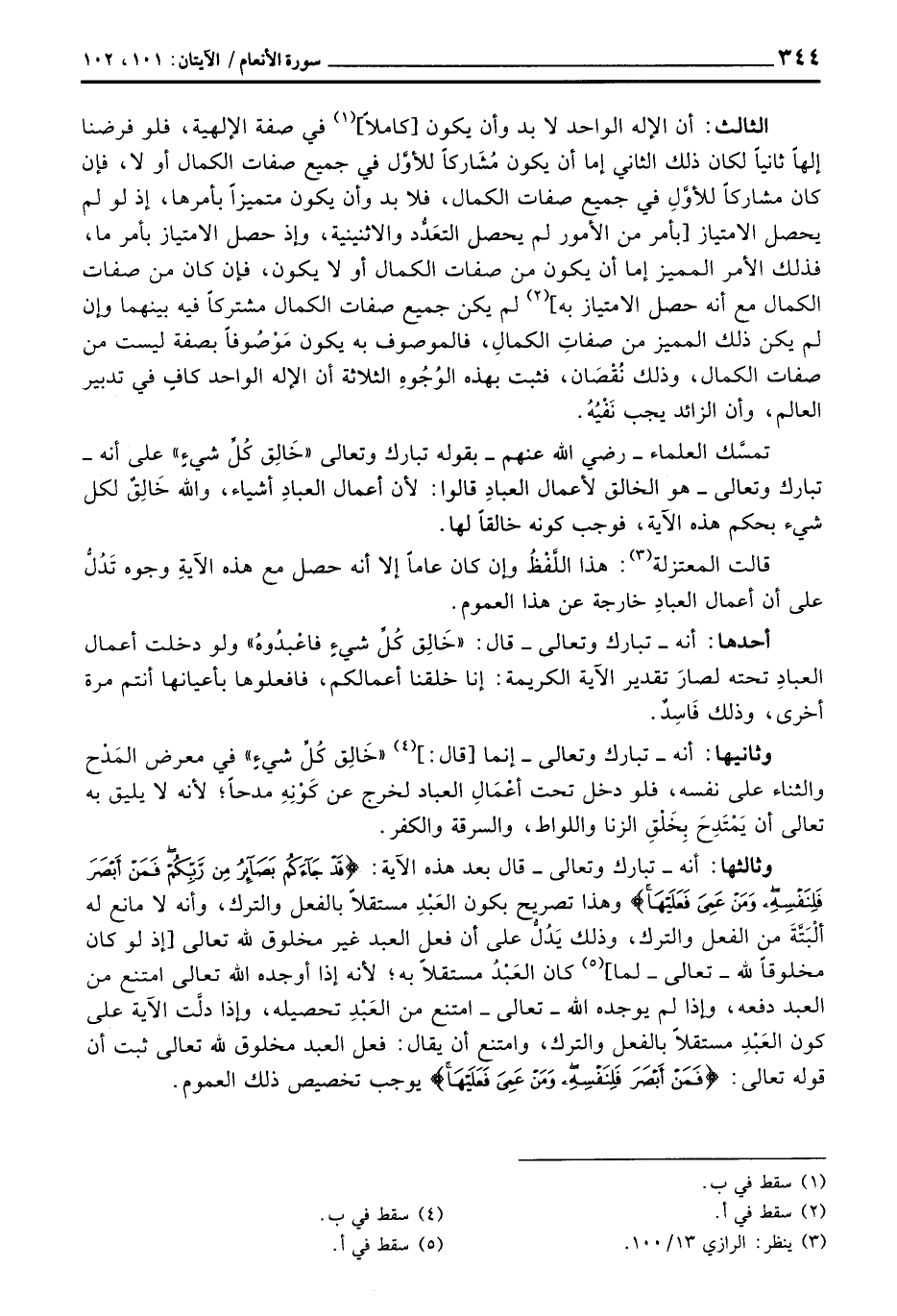 الثالث: أن الإله الواحد لا بد وأن يكون [كاملاً] في صفة الإلهية، فلو فرضنا إلهاً ثانياً لكان ذلك الثاني إما يكون مُشَاركاً لأوَّل في جميع صفات الكمال أو لا، فإن كان مشاركاً للأوَّلِ في جميع صفات الكمال، فلا بد وأن يكون متميزاً بأمرها، إذ لو لم يحصل الأمر المميز إما أن يكون من صفات الكمال أو لا يكون، فإن كان من صفات الكمال مع أنه حصل الامتياز به] لم يكن جميع صفات الكمال مشركاً فيه بينهما وإن لم يكن ذلك المميز نُقْصَان، فثبت بهذه الوُجُوهِ الثلاثة أن الإله الواحد كافٍ في تدبير العالم، وأن الزائد يجب نَفْيُهُ.
