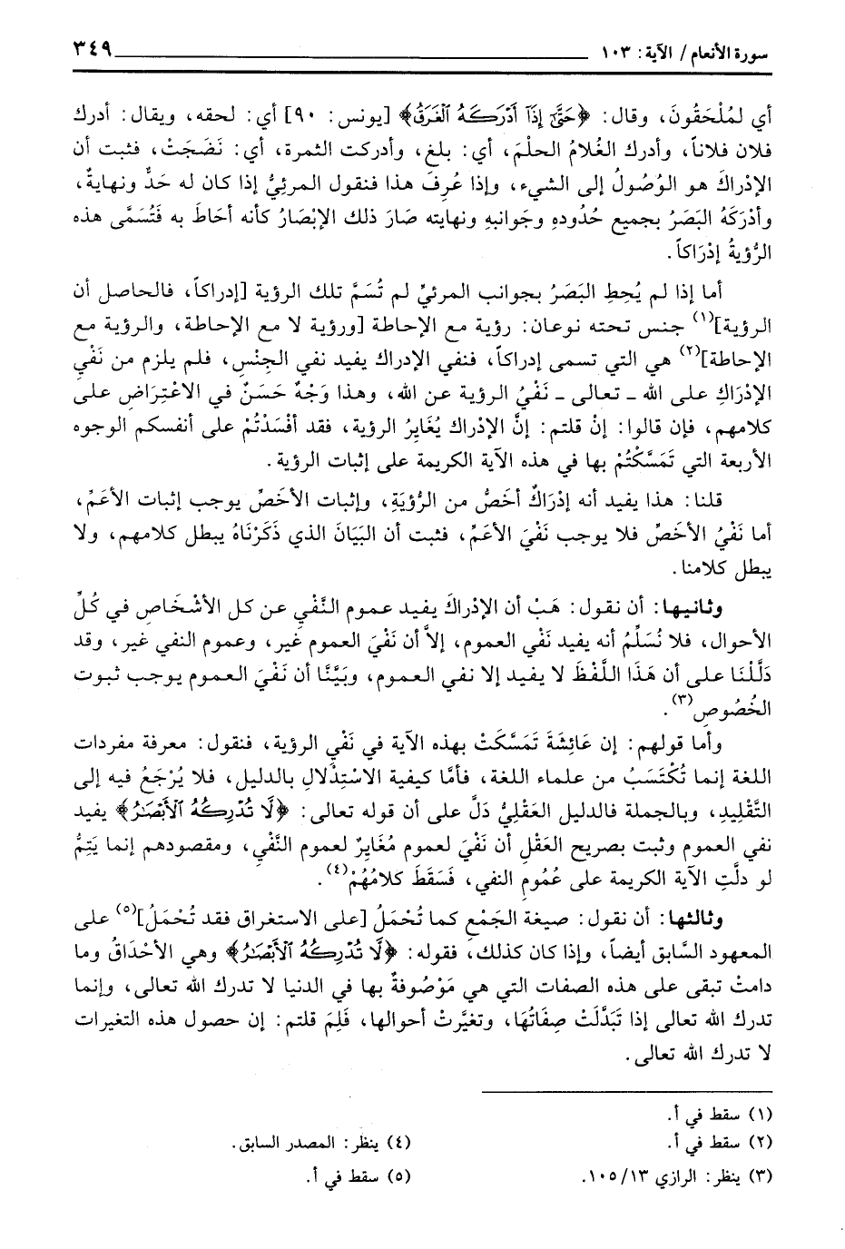 أما إذا لم يُحِطِ البَصَرُ بجوانب المرئيَّ لم تُسَمَّ تلك الرؤية [إدراكاً، فالحاصل أن الرؤية] جنس تحته نوعان: رؤية مع الإحاطة [ورؤية لا مع الإحاطة، والرؤية مع الإحاطة] هيا لتي تسمى إدراكاً، فنفي الإدراك يفيد نفي الجِنْسِن فلم يلزم من نَفْي الإدْرَاكِ على الله - تعالى - نَفْيُ الرؤية عن الله، وهذا وَجْهٌ حَسَنٌ في الاعْتِرَاضَ على كلامهم، فإن قالوا: إنْ قلتم: إنَّ الإدْراك يُغَايِرُ الرؤية، فقد أفْسَدْتُمْ على أنفسكم الوجوه الأربعة التي تَمَسَّكْتُمْ بها في هذا الآية الكريمة على إثبات الرؤية.