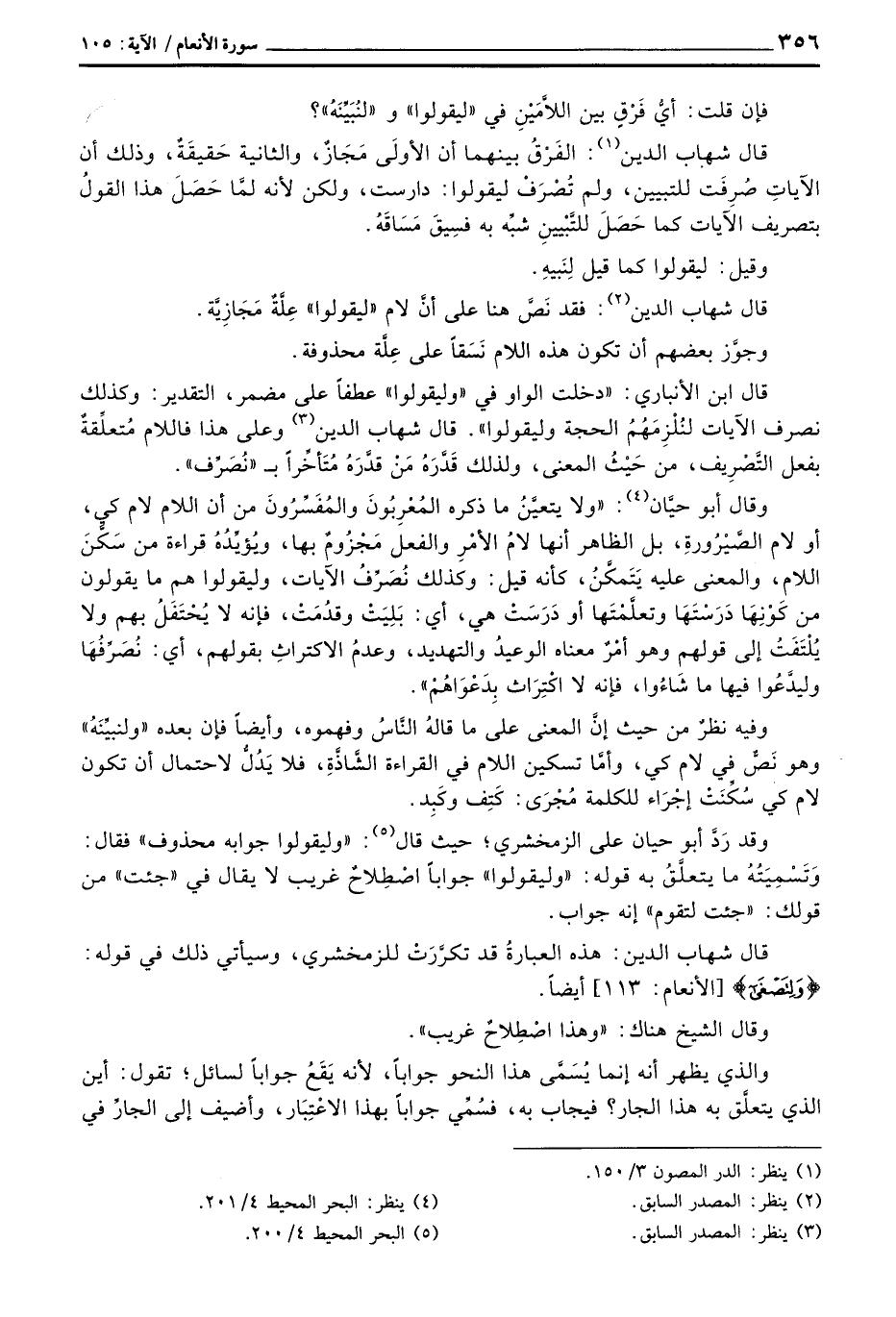 قال ابن الأنباري: «خلت الواو في» وليقولوا «عطفاً على مضمر، التقدير: وكذلك نصرف الآيات لنُلْزِمَهُمُ الحجة وليقولوا» . قال شهاب الدين وعلى هذا فاللام مُتعلِّقَةٌ بفعل التَّصْرِيف، من حَيْثُ المعنى، ولذلك قَدَّرَهُ مَنْ قدَّرَهُ مُتَأخِّراً ب «نُصَرِّف» .
