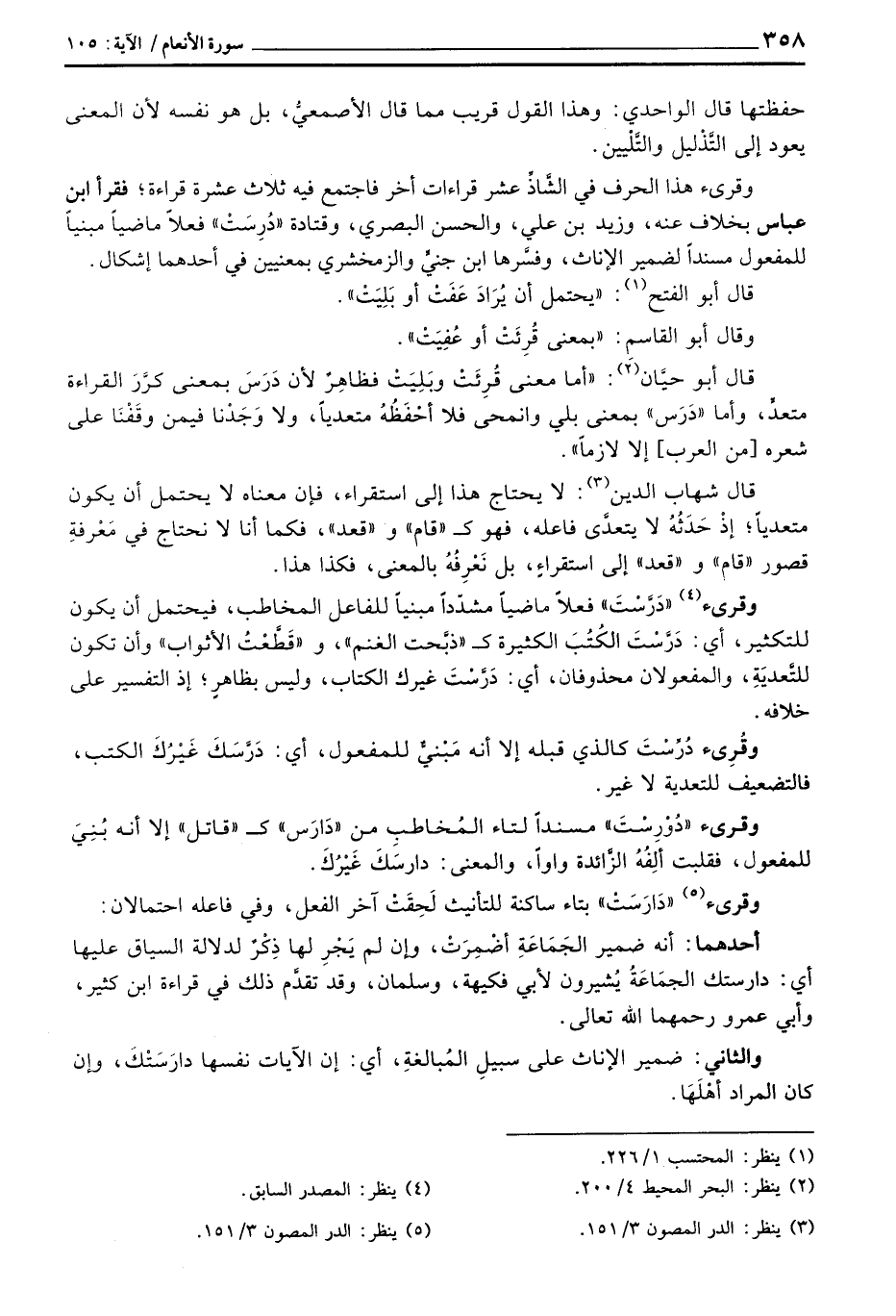 قال أبو حيَّان: «أما معنى قُرِئَتْ وبَلِيَتْ فظاهِرٌ لأن دَرَسَ بمعنى كرَّرَ القراءة متعدِّ، وأما» دَرَس «بمعنى بلي وانمحى فلا أحْفَظُهُ متعدياً، ولا وَجَدْنا فيمن وقَفْنَا على شعره [من العرب] إلا لازماً» .