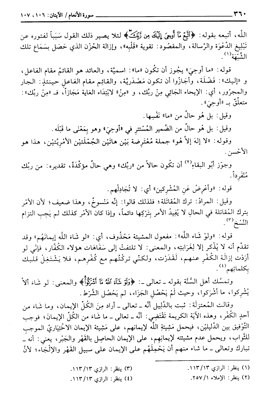 قوله: «ولوْ شَاء اللَّه» مفعول المشيئة مَحْذُوف، أي: «لو شَاءَ اللَّه إيمانَهُم» وقد تقدَّم أنه لا يُذْكر إلا لِغَرَابتِه، والمعنى: لا تلتفتْ إلى سَفَاهَات هؤلاء الكُفَّار، فإنّي لو أرَدْت إزالَة الكُفْرِ عنهم، لَقَدَرْت، ولكنِّي تركْتُهم مع كُفْرِهم، فلا يَشْتَغِل قلبك بِكلماتِهم.