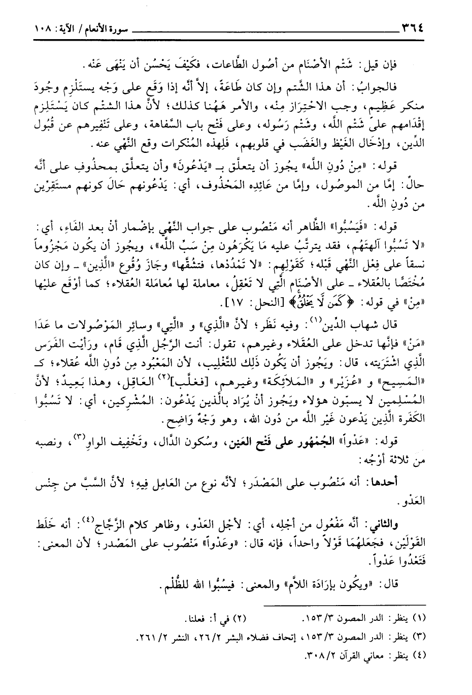 قال شهاب الدِّين: وفيه نَظَر؛ لأنَّ «الَّذِي» و «الَّتِي» وسائِر المَوْصُولات ما عَدَا «مَنْ» فإنَّها تدخل على العُقَلاء وغيرهم، تقول: أنت الرُّجُل الَّذِي قَام، ورَأيْت الفَرَس الَّذِي اشْتَرَيته، قال: ويَجُوز أن يَكُون ذَلِك للتَّغُلِيب، لأن المَعْبُود مِن دُون اللَّه عُقلاء؛ ك «المَسِيح» و «عُزَيْر» و «المَلاَئِكَة» وغيرهم، [فغلَّب] العَاقِل، وهذا بَعِيدٌ؛ لأنَّ المُسْلِمين لا يسبّون هؤلاء ويَجُوز أنْ يُرَاد بالَّذين يَدْعُون: المُشْرِكين، أي: لا تَسُبُّوا الكَفَرة الَّذِين يَدْعون غَيْر اللَّه من دُون الله، وهو وَجْهٌ وَاضِح.