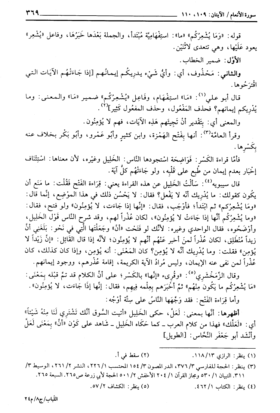 قال سيبويه: سَألْتُ الخَلِيل عن هذه القراءة عين: قِرَاءة الفَتْح فَقُلْت: ما مَنَع أن يكُون كقولك: ما يُدْرِيك أنّه لا يَفْعل؟ فقال: لا يَحْسُن ذلك في هذا المَوْضِع، إنَّما قال: «ومَا يُشْعِرُكم» ثم ابْتِدأ؛ فأوْجَب، فقال: «إنَّها غذا جَاءَت، لا يُؤمِنُون» لو فتحن فقال: «وما يُشْعِرُكُم أنَّها إذا جَاءَتْ لا يُؤمِنُون» ، لكان عُذْراً لهم، وقد شرح النَّاس قَوْل الخَلِيل، وأوْضَحُوه، فقال الواحدي وغيره: لأنَّك لو فَتَحْت «أنّ» وجَعَلْتَها الَّتِي في نَحْو: بَلَغَنِي أنَّ زيداً مُنْطَلِق، لكان عُذْراً لمنَ أخبر عَنْهُم أنَّهم لا يُؤمِنُون؛ لأنَّه إذا قال القَائِل: «إنَّ زَيْداً لا يُؤمِن» فقلت: وما يُدْرِيك أنَّه لا يُؤمِن؟ كان المَعْنَى: أنه يُؤمِن، وإذا كان كذلك، كان عُذْراً لمن نفي عنه الإيمان، وليس مُرادُ الآية الكريمة، إقامة عُذْرهم، ووجود إيمانهم.