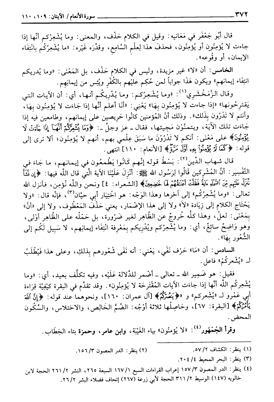 قال شهاب الدِّين: بَسْطُ قوله إنَّهم كَانُوا يَطْمعُون في إيمانهم، ما جَاءَ في التَّفْسِير: أن المُشْركين قَالُوا لِرسُول الله صَلَّى اللَّهُ عَلَيْهِ وَسَلَّم َ: أنْزِلَ عَلَيْنَا الآية الَّتي قال اللَّه فيها: {إِن نَّشَأْ نُنَزِّلْ عَلَيْهِمْ مِّنَ السمآء آيَةً فَظَلَّتْ أَعْنَاقُهُمْ لَهَا خَاضِعِينَ} [الشعراء: 4] ونحن واللَّه نُؤمِن، فأنزل الله تعالى: «وما يُشْعِرُكُم» إلى آخرها وهذا الوَجْه: هو اخْتِيَار أبي حيَّان، فإنَّه قال: «ولا يَحْتَاج الكلام إلى زِيَادة» لاَ «ولا إلى هذا الإضْمَار، يعني حَذْفَ المَعْطُوف، ولا إلى» أنَّ «بِمَعْنَى: لعَّل، وهذا كلُّه خُرودٌ عن الظَّاهِر لغير ضَرُورة، بل حَمْلُه على الظَّاهِر أوْلى، وهو وَاضِحٌ سائغٌ، أي: وما يُشْعِرُكم ويُدْرِيكم بِمَعْرِفة انْتِفَاء إيمانهم، لا سَبِيل لَكُم إلى الشُّعُور بِهَا» .