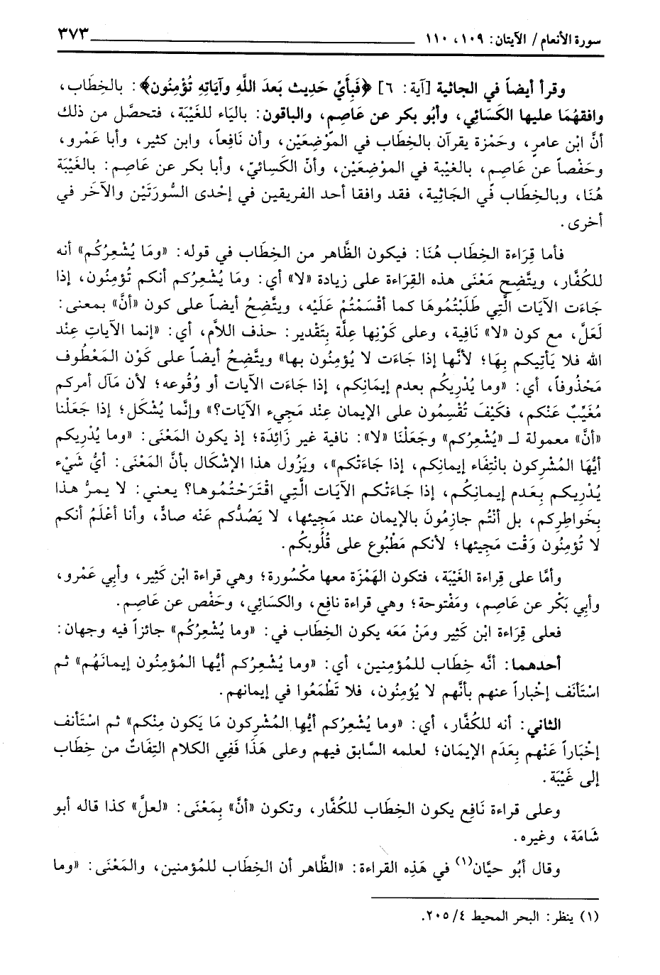 فأما قِرَاءة الخِطَاب هُناَ: فيكون الظَّاهر من الخِطاب في قوله: «ومَا يُشْعِرُكُم» أنه للكُفَّار، ويتَّضح مَعْنَى هذه القِرَاءة على زيادة «لا» أي: ومَا يُشْعِرُكم أنكم تُؤمِنُون، إذا جَاءَت الآيَات الَّتِي طَلَبْتُمُوها كما أقْسَمْتُم عَلَيْه، ويتَّضحُ أيضاً على كون «أنَّ» بمعنى: لَعَلَّ، مع كون «لا» نَافِية، وعلى كَوْنِها عِلَّة بِتَقْدير: حذف اللاَّم، أي: «إنما الآيات عِنْدالله فلا يَأتِيكم بِهَا؛ لأنَّها إذا جَاءَت لا يُؤمِنُون بها» ويتَّضِحُ أيضاً على كَوْن المَعْطُوف مَحْذُوفاً، أي: «وما يُدْرِيكم بعدم إيمَانِكم، إذا جاءَت الآيات أو وُقُوعه؛ لأن مَآل أمركم مُغَيِّبٌ عَنْكم، فكَيْفَ تُقْسِمُون على الإيمان عِنْد مَجِيئ الآيات؟» وإنَّما يُشْكَل؛ إذا جَعَلْنا «أنَّ» معمولة ل «يُشْعِرُكم» وجَعَلْنَا «لا» : نافية غير زَائِدَة؛ إا يكون المَعْنَى: «وما يُدْرِيكم أيُّهَا المُشْرِكون بانْتِفَاء إيمانكم، إذا جَاءَتْكم» ، ويَزُول هذا الإشْكَال بأنَّ المَعْنَى: «وما يُدْريكم أيُّها المُشْرِكون بانْتِفَاء إيمانِكم، وإذا جَاءَتْكم» ، ويَزُول هذا الإشْكَال بأنَّ المَعْنى: ايُّ شَيءْ يُدْرِيكم بِعَدم إيمانِكُم، إذا جَاءَتْكم الآيَات الَّتِي اقْتَرَحْتُمُوها؟ يعني: لا يمرُّ هذا بِخَواطِرِكم، بل أنْتُم جازِمُونَ بالإيمان عند مجيئها، لا يَصْدُّكم عَنْه صادٌّ، وأ، اأعْلَمُ أنكم لا تُؤمِنُون وَقْت مَجِيئها؛ لأنكم مَطْبُوع على قُلُوبكُم.