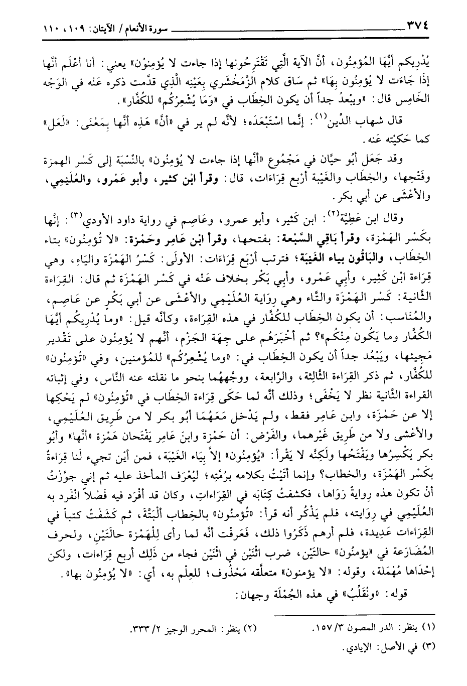 وقال ابن عَطِيَّة: ابن كَثير، وأبو عمرو، وعَاصِم في رواية داود الأودي] : إنَّها بكَسْر الهَمْزة، وقرأ بَاقِي السَّبْعة: بفتحها، وقرأ ابْن عَامِر وحَمْزة:» لا تُؤمِنُون «بتاء الخِطَاب، والبَاقُون بياء الغَيْبَة؛ فترتب أرْبَع قِرَاءات: الأولَى: كَسْرُ الهَمْزَة واليَاءِ، ويه قِرَاءة ابْن كَثِير، وأبي عَمْرو، وأبِي بَكْر بخلاف عَنْه في كَسْر الهَمْزَة ثم قال: القِرَاءة الثَّانية: كَسْر الهَمْزَة والتَّاء ويه رِوَاية العُلَمِي والأعْشَى عن أبي بَكْرٍ عن عَاصِم، والمُنَاسب: أن يكون الخِطَاب للكُفَّار في هذه القِرَاءة، وكأنَّه قيل:» وما يُدْرِيكُم أيُّهَا الكُفَّار وما يَكُون مِنْكُم «؟ ثم أخْبرَهُم على جِهَة الجَزَم، أنَّهم لا يُؤمِنُون على تقدير مَجِيئها، ويَبْعُد جداً أن يكون الخِطَاب في:» وما يُشْعِرُكُم «للمُؤمنين، وفي» تُؤمِنُون «لكُفَّار، ثم ذكر القِرَاءة الثُّالِثة، والرَّابعة، ووجَّههُا بنحو ما نقلته عن النَّاس، وفي إثباته القراءة الثَّانية نظر لا يَخْفَى؛ وذلك أنَّه لما حَكَى قِرَاءة الخِطَاب في» تُؤمِنُون «لم يَحْكِها إلا عن حَمْزَة، وابن عَامِر فقط، ولم يَدْخل مَعَهُمَا أبُو بكر لا من طريق العُلَيْمِي، والأعْشى ولا من طَريق غَيْرهما، والفَرْض: أن حَمْزة وابنَ عَامِر يَفْتَحان هَمْزة» أنَّها «وأبُوا بكر يَكْسِرُها وَيفْتَحُها ولِكِنَّه لا يَقْرأ:» يُؤمِنُون «إلاَّ بِيَاء الغَيْبَة، فمن أيْن تجيئ لَنا قِرَاءةٌ بكَسْر الهَمْزة، والخطاب؟ وإنما أتَيْتُ بكلامه برُمَّتِه؛ ليُعْرَف المأخذ عليه ثم إني جوَّزْتُ أنْ تكون هذه رِيوايةً رَوَاها، فكشفتُ كِتَابَه في القِرَاءاتِ، وكان قد أفْردَ فيه فَصْلاً انْفَرد به العُلَيْمِي في رِوَايته، فلم يَذْكُر أنه قرأ:» تُؤمنُون «بالخِطاب ألبَتَّةَ، ثم كَشَفْتُ كتبا في القِرَاءات عَدِيدة، فلم أرهم ذَكَرُوا ذلك، فَعَرفْت أنَّه لما رأيى لِلْهَمْزة حالَتَيْنِ، ولحرف إحْدَاها مُهْمَلة، وقوله:» لا يؤمنون «متعلِّقه مَحْذُوف؛ للعِلْم به، أي:» لايُؤمِنُون بها «.