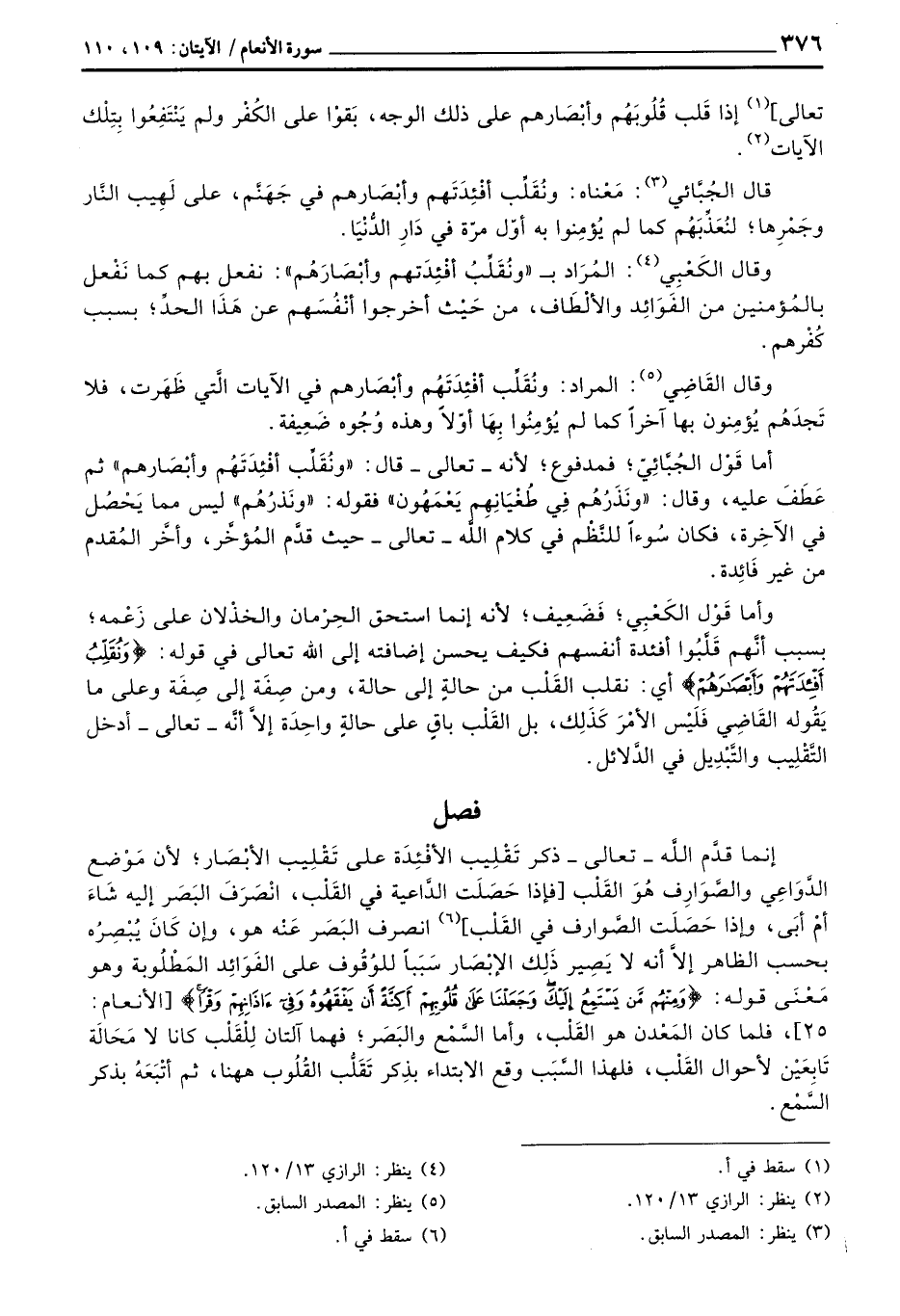 أما قَول الجُبَّائيّ؛ فمدفوع؛ لأنه - تعالى - قال: «ونُقَلِّب أفْئِدَتَهُمو أبْصَارهم» ثم عَطَفْ عليه، وقال: «ونَذَرُهُم فِي طُغْيَانِهِم يَعْمَهُون» فقوله: «ونَذرُهُم» لي مما يَحْصُل في الآخِرة، فكان سُوءاً للنَّظءم في كلام اللَّه - تعالى - حيث قدَّم المُؤخَّر، وأخَّر المُقدم من غير فَائِدة.