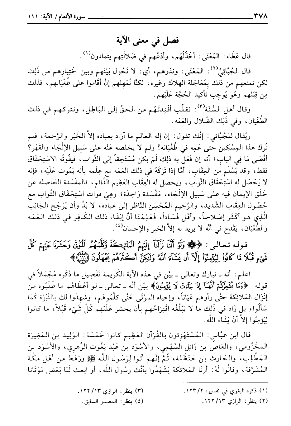 ويُقال للجُبَّائي: إنَّك تقول: إن إله العالم ما أرَاد بعباده إلاَّ الخَيْر والرَّحمة، فمل تُرك هذا المِسْكِين حتى عَمِه في طُغْيَانه؟ ولم لا يخلصه عَنْه على سَبِيل الإلْجَاء والقَهْر؟ أقْصَى مَا فِي البابِ؛ أ، هـ إن فَعل به ذلِك لَمْ يكن مُسْتَحِقاً إلى الثَّواب، فيقُوتُه الاسْتِحْقَاق فقط، وقد يَسْلَم من العِقَاب، أمَّا إذا تَرَكَهُ في ذلك العَمَه مع عِلْمه بأنه يَمُوت عَلَيْه، فإنه لا يَحْصُل له اسْتِحْقاق الثَّواب، ويحصل له العِقَاب العَظيم الدَّائم، فالمفْسَدة الحَاصلة عن خَلْق الإيمان فيه على سَبيل الإلْجَاء، مَفْسَدة وَاحِدَة؛ وهِيَ قوات اسْتِحْقَاق الثَّواب مع حُصُول العِقَاب الشَّديد، والرَّحِيم المُحْسِن النَّاظر إلى عباده، لا بُدَّ وأن يُرَجَّح الجَانِب الَّذِي هو أكْثَر إصْلاحاً، وأقَل فَسَاداً، فَعَلِمْنَا أنَّ إبْقَاء ذكل الكَافِر في ذلك العَمَه والطُّغْيَان، يَقْدح في أنَّه لا يريد به إلاَّ الخير والإحسان.