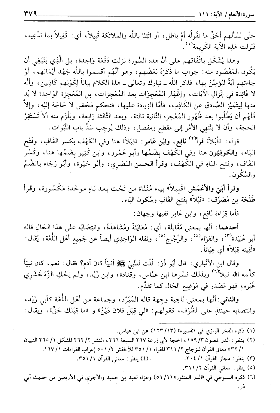 قوله: «قُبُلاً» قرأ نَافِع، وابْن عَامِر: «قِبَلاً» هنا وفي الكَهْف بكسر القَافِ، وفَتْح البَاء، والكوفِيُّون هنا وفي الكَهْف، وقرأ الحسن البَصْرِي، وأبُو حَيْوة، وأبُو رَجَاء بالضَّمِّ والسُّكُون.