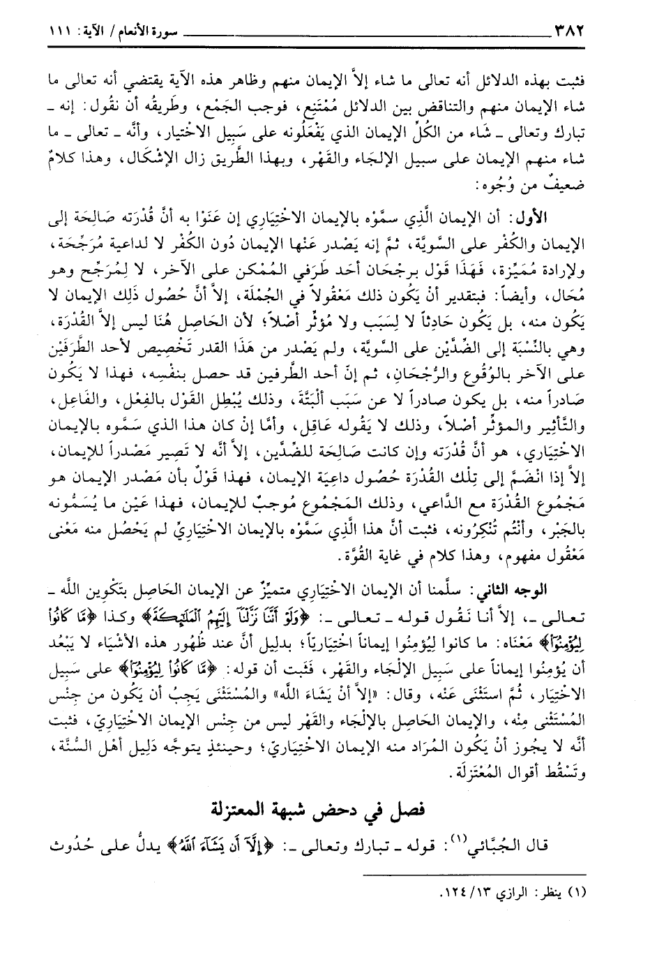 الأول: أن الإيمان الَّذِي سمَّوْه بالإيمان الاخْتِيَاري إن عَنُوْا به أنَّ قُدْرَته صَالِحَة إلى الإيمان والكُفْر على السَّويَّة، ثمَّ إنه يَصْدر عَنْها الإيمان دُون الكُفْر لا لداعية مُرَجَّحَة، ولإرادة مُمَيِّزة، فَهَذَا قَوْل برجْحَان أحَد طَرَفي المُمْكن على الآخر، لا لِمُرَجِّح وهو مُحَال، وأيضاً: فبتقدير أنْ يَكُون ذلك مَعْقُولاً في الجُمْلَة، إلاَّ أنَّ حُصُول ذَلِك الإيمان لا يَكُون منه، بل يَكُون حَادِثاً لا لِسَبَب ولا مُؤثِّر أصْلاً؛ أن الحَاصِل هَنَا لي إلاَّ القُدْرَة، وهي بالنِّسْبَة إلى الضِّدَّيْن على السَّويَّة، ولم يَصْدر من هَذَا القدر تَخْصِيً لأحد الطَّرَفَيْن على الآخر بالوُقُوع والرُّجْحَانِ، ثم إنّ احد الطَّرفين قد حصل بنفْسِه، فهذا لا يَكُون صَادراً منه، بل يكون صادراً لا عن سَبَب ألْبَتَّةَ، وذلك يُبْطِل القَوْل بالفِعْل، والفَاعِل، والتَّأثِير والمؤثِّر أصْلاً، وذلك لا يَقْوله عَاقِل، وأمَّا إنْ كان هذا الذي سَسَّوه بالإيمان الاخْتِيَاري، هو أنَّ قُدْرَته وإن كانت صَالِحة للضَّدَّين، إلاَّ أنَّه لا تَصِير مَصْدراً للإيمان، إلاَّ إذا انْضَمَّ إلى تِلْك القُدْرَة حُصُول داعِيَة الإيمان، فهذا قَوْلٌ بأن مَصْدر الإيمان هو مَجْمُوع القُدْرَة على الدَّاعي، وذلك المَجْمُوع مُوجبٌ للإيمان، فهذا عين ما يسمونه بالجبر، وأنتم تنكرونه، فثبت أن هذا الذي سموه بالإيمان الاخْتِيَاريِّ لم يَحْصُل منه مَعْنى مَعْقُول مفهوم، وهذا كلام في غاية القُوَّة.