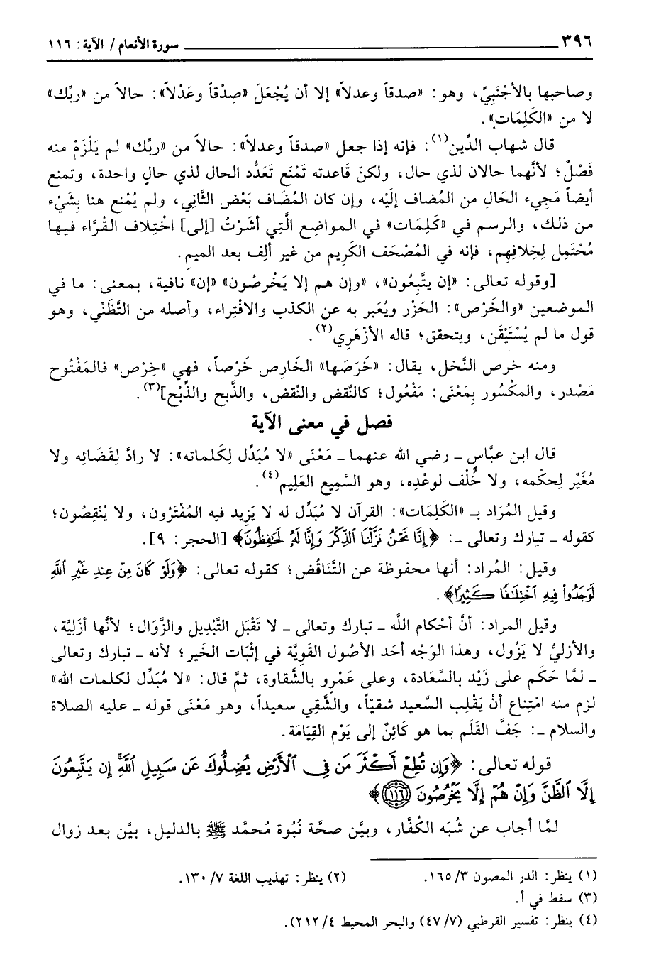 قال شهاب الدِّين: فإنه إذا جعل «صدقاً وعدلاً» : حالاً من «ربِّك» لم يَلْزَمْ منه فَصْلٌ؛ لأنَّها حالان لذي حال، ولكنّ قَاعدته تَمْنَع تَعَدُّد الحال لذي حالٍ واحدة، وتمنع أيضاً مَجِيء الحَالِ من المُضاف إلَيْه، وإن كان المُضَاف بَعْض الثُّانِي، ولم يُمْنعن هنا بِشَيْء من ذلك، والرسم في «كَلِمَات» في المواضعِ الِّتِي أشَرْتُ [إلى] اخْتِلاف القُرَّاء فيها مُحْتَمِل لِخِلافِهِهم، فإنه في المُصْحَف الكَرِيم من غير ألِف بعد الميم.