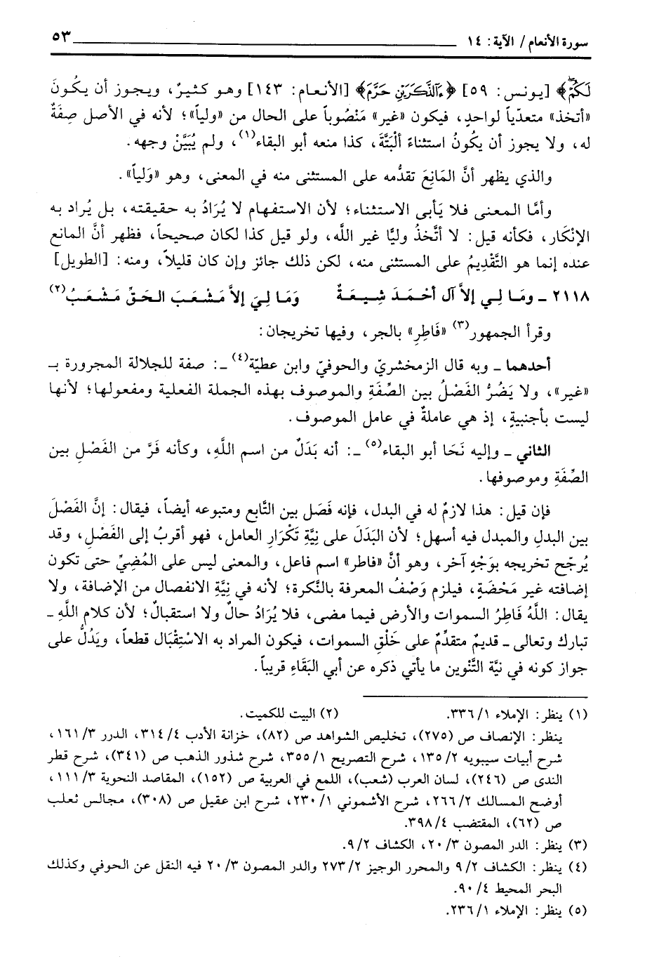 فإن قيل: هذا لازمٌ له في البد، فإنه فَصَل بين التاَّبع ومتبوعه أيضاً، فيقال: إنَّ الفَصْلَ بين البدلِ والمبدل فيه أسهلح لأن البَدَلَ على نِيَّةِ تَكْرَارِ العمال، فهو أقربُ إلى الفَصْلِ، وقد يُرجَح تخريجه بوَجْهِ آخر، وهو أنَّ» فاطر «اسم فاعل، والمعنى ليس على المُضِيِّ حتى تكون إضافته غير مَحْضَةٍ، فيلزم وَصْفُ المعرفة بالنَّكرة؛ لأنه في نيَّةِ الانفصال من الإضافة، ولا يقال: اللَّهُ فَاطِرُ السموات والأرض فيما مضى، فلا يُرَادُ حالٌ ولا استقبالٌ؛ لأن كلام اللِّهِ - تبارك وتعالى - قديمٌ متقدّمٌ على خَلْقِ السموات، فيكون المراتد به الاسْتِقْبَال قطعاً، ويَدُلُّ على جواز كونه في نيَّة التَّنْوين ما يأتي ذكره عن أبي البَقَاءِ قريباً.