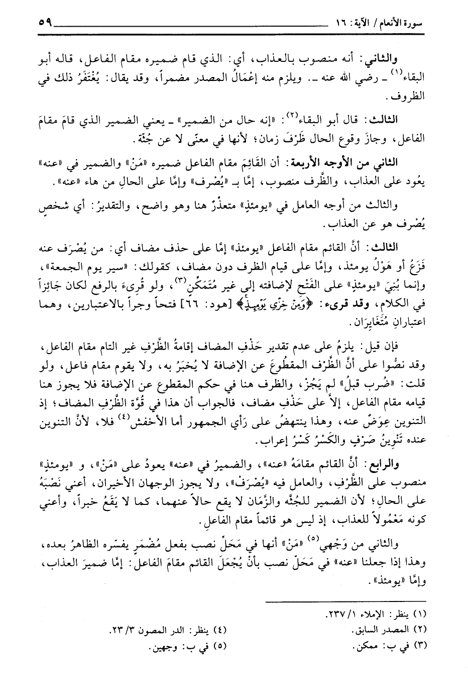 والرابع: أنَّ القائم مقامَهُ «عنه» ، والضميرُ في «عنه» يعودُ على «مَنْ» ، و «يومئذٍ» منصوب على الظَّرْفِ، والعامل فيه «يُصْرَفْ» ، ولا يجوز الوجهان الأخيران، أعني نَصْبَهُ على الحالِ، لأن الضمير لجُثَّة والزَّمَان لا يقع حالاً عنهما، كما لا يَقَعُ خبراً، وأعني كونه مَعْمُولاً للعذاب، إذ ليس هو قائماً مقام الفاعلِ.