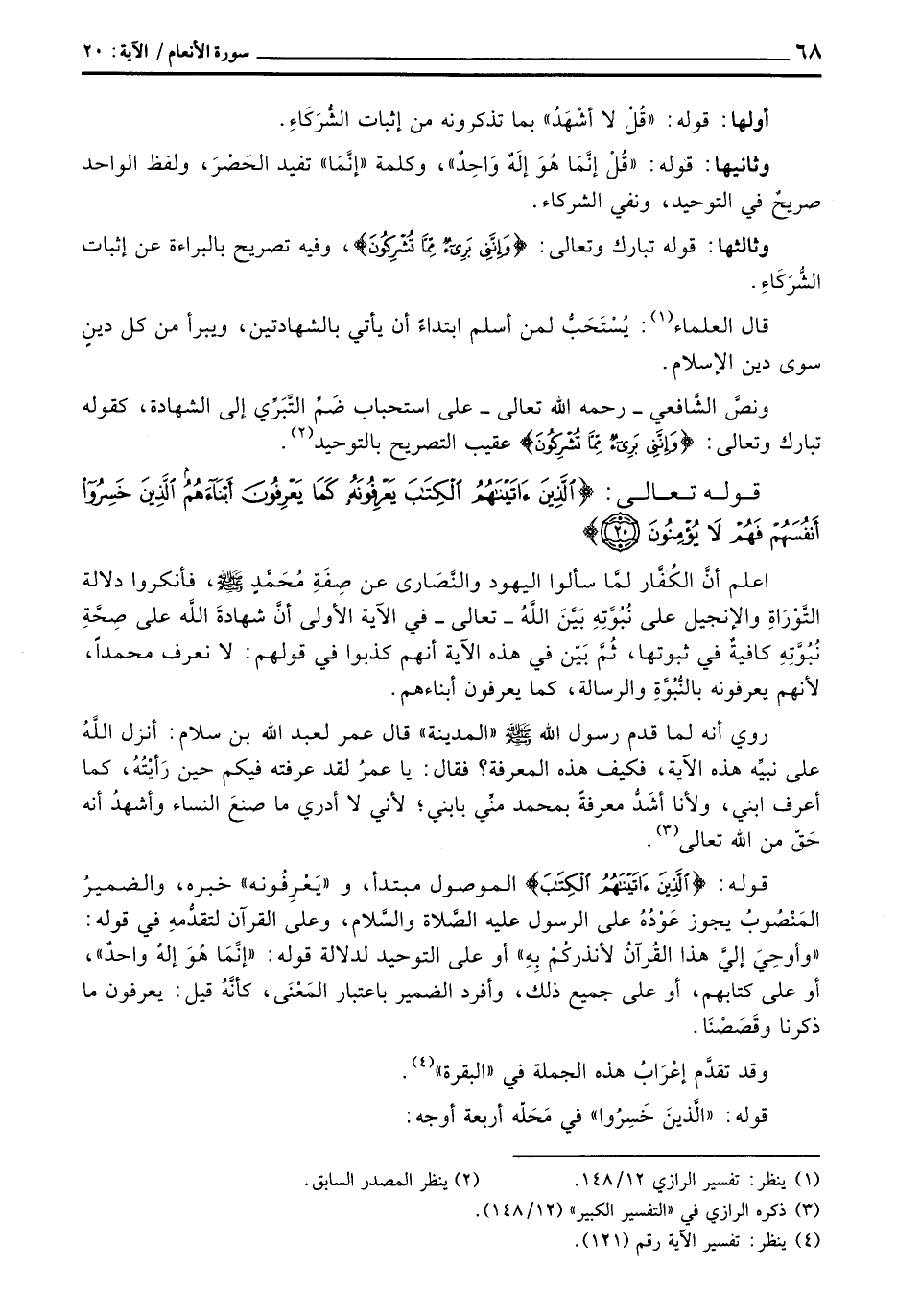 قوله: {الذين آتَيْنَاهُمُ الكتاب} الموصول مبتدأن و «يَعْرِفُونه» خبره، والضميرُ المَنْصُوبُ يجوز عَوْدُهُ على الرسول صلى اله عليه الصَّلاة والسَّلام، وعلى القرآن لتقدُّمهِ قوله: «وأوحِيَ إليَّ هذا القُرآنُ لأنذركُمْ بِهِ» أو على التوحيد لدلالة قوله: {إِنَّمَا هُوَ إله وَاحِدٌ} [الأنعام: 19] أو على كتابهم، أو على جميع ذلك، وأفرد الضمير باعتبار المَعْنَى، كأنَّهُ قيل: يعرفون ما ذكرنا وقَصَصْنَا.
