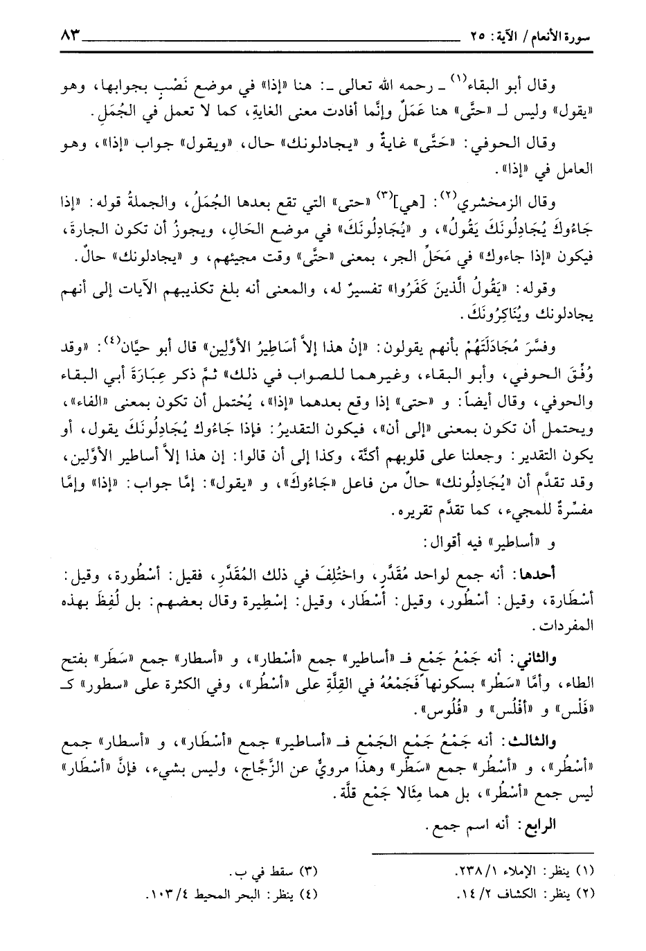 وفسَّرَ مُجَادَلَتَهُمْ بأنهم يقولون: {إِنْ هاذآ إِلاَّ أَسَاطِيرُ الأولين} قال أبو حيَّان: «وقد وُفَّقَ الحوفي، وأبو البقاء، وغيرهما للصواب في ذلك» ثمَّ ذكر عِبَارَةَ أبي البقاء والحوفي، وقال أيضاً: و «حتى» إذا وقع بعدهما «إذا» ، يُحْتمل أن تكون بمعنى «الفاء» ، ويحتمل أن تكون بمعنى «إلى أن» ، فيكون التقديرُ: فإذا جَاءُوك يُجَادِلُونَكَ يقول، أو يكون التقدير: وجعلنا على قلوبهم أكنَّة، وكذا إلى أن قالوا: إن هذا إلاَّ أساطير الأوَّلين، وقد تقدَّم أن «يُجَادِلُونك» حالٌ من فاعل «جَاءُوكَ» ، و «يقول» : إمَّا جواب: «إذا» وإمَّا مفسَّرةٌ للمجيء، كما تقدَّم تقريره.