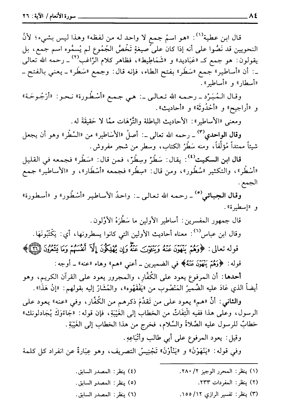 وقال الجبائي - رَحِمَهُ اللَّهُ تعالى -: واحدُ الأساطير «أسْطُور» و «أسطورة» و «إسطيرة» .