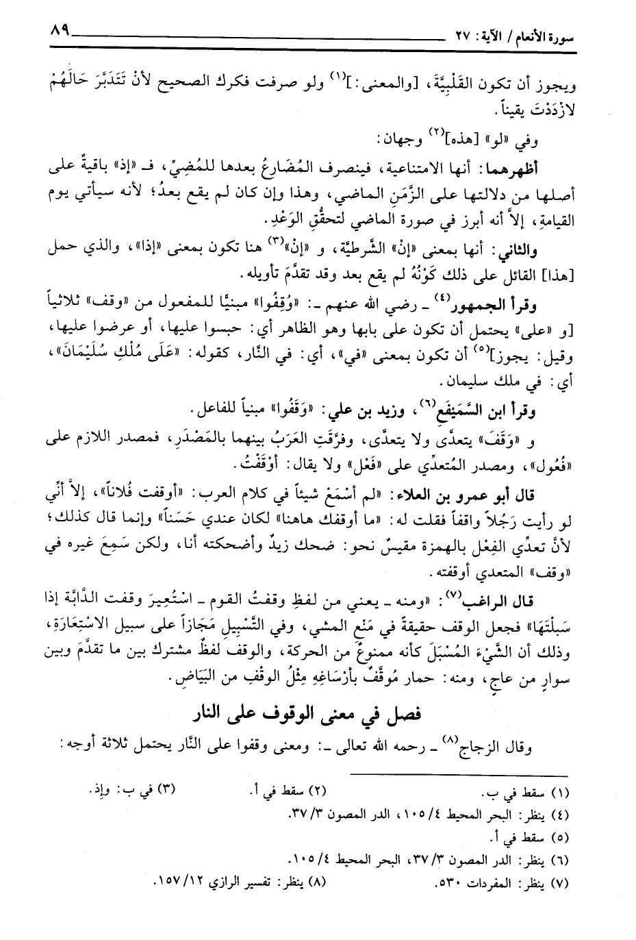 وقال الزجاج - رَحِمَهُ اللَّهُ تعالى -: ومعنى وقفوا على النَّار يحتمل ثلاثة أوجه: