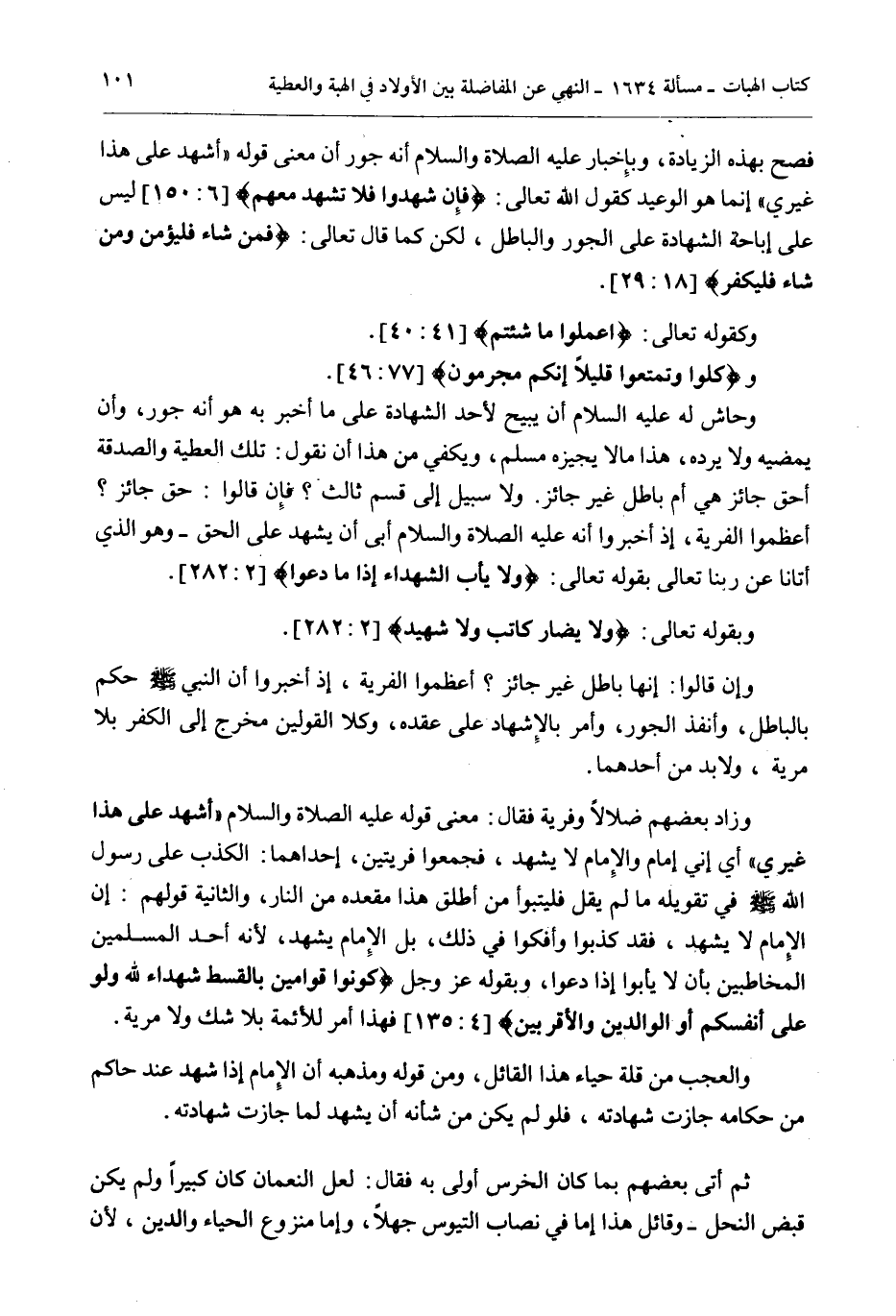 فَصَحَّ بِهَذِهِ الزِّيَادَةِ، وَبِإِخْبَارِ - عَلَيْهِ الصَّلَاةُ وَالسَّلَامُ - أَنَّهُ جَوْرٌ أَنَّ مَعْنَى قَوْلِهِ «أَشْهِدْ عَلَى هَذَا غَيْرِي» إنَّمَا هُوَ الْوَعِيدُ كَقَوْلِ اللَّهِ تَعَالَى: {فَإِنْ شَهِدُوا فَلا تَشْهَدْ مَعَهُمْ} [الأنعام: 150] لَيْسَ عَلَى إبَاحَةِ الشَّهَادَةِ عَلَى الْجَوْرِ وَالْبَاطِلِ، لَكِنْ كَمَا قَالَ تَعَالَى: {فَمَنْ شَاءَ فَلْيُؤْمِنْ وَمَنْ شَاءَ فَلْيَكْفُرْ} [الكهف: 29] .