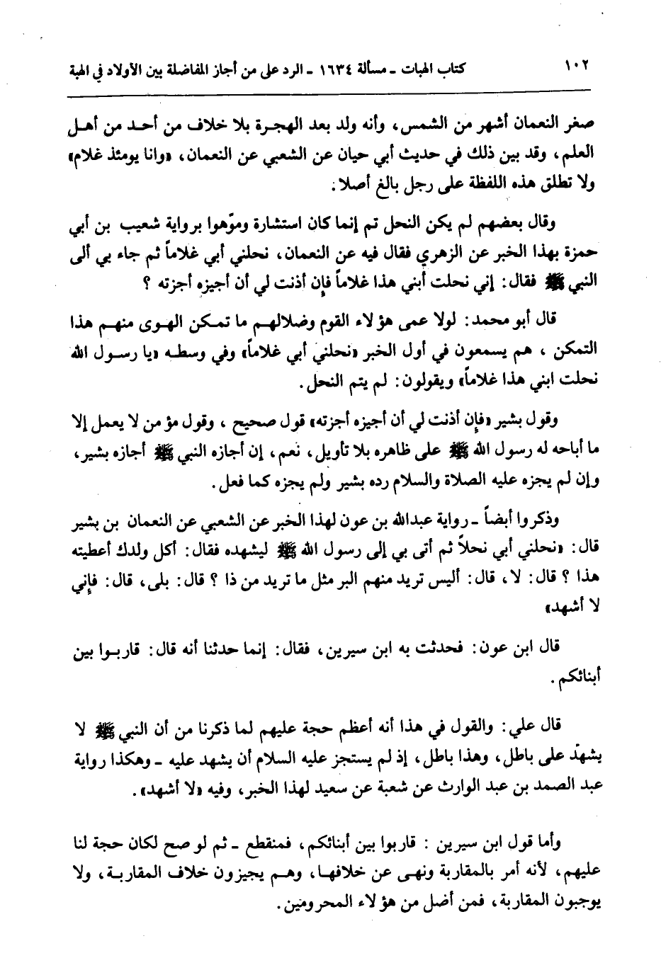 قَالَ عَلِيٌّ: وَالْقَوْلُ فِي هَذَا أَنَّهُ أَعْظَمُ حُجَّةٍ عَلَيْهِمْ لِمَا ذَكَرْنَا لِمَا أَنَّ النَّبِيَّ - صَلَّى اللَّهُ عَلَيْهِ وَسَلَّمَ - لَا يَشْهَدُ عَلَى بَاطِلٍ، وَهَذَا بَاطِلٌ، إذْ لَمْ يَسْتَجِزْ - عَلَيْهِ السَّلَامُ - أَنْ يَشْهَدَ عَلَيْهِ - وَهَكَذَا رِوَايَةُ عَبْدِ الصَّمَدِ بْنِ عَبْدِ الْوَارِثِ عَنْ شُعْبَةَ عَنْ سَعِيدٍ لِهَذَا الْخَبَرِ، وَفِيهِ «لَا أَشْهَدُ» . وَأَمَّا قَوْلُ ابْنِ سِيرِينَ: قَارِبُوا بَيْنَ أَبْنَائِكُمْ، فَمُنْقَطِعٌ - ثُمَّ لَوْ صَحَّ لَكَانَ حُجَّةً لَنَا عَلَيْهِمْ؛ لِأَنَّهُ أَمَرَ بِالْمُقَارَبَةِ وَنَهَى عَنْ خِلَافِهَا، وَهُمْ يُجِيزُونَ خِلَافَ الْمُقَارَبَةِ، وَلَا يُوجِبُونَ الْمُقَارَبَةَ، فَمَنْ أَضَلُّ مِنْ هَؤُلَاءِ الْمَحْرُومِينَ.