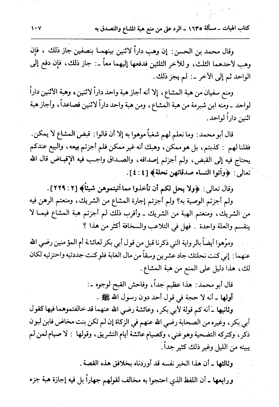 قَالَ أَبُو مُحَمَّدٍ: وَمَا نَعْلَمُ لَهُمْ شَغَبًا مَوَّهُوا بِهِ إلَّا إنْ قَالُوا: قَبْضُ الْمُشَاعَ لَا يُمْكِنُ. فَقُلْنَا لَهُمْ: كَذَبْتُمْ، بَلْ هُوَ مُمْكِنٌ، وَهَبْكَ أَنَّهُ غَيْرُ مُمْكِنٍ فَلِمَ أَجَزْتُمْ بَيْعَهُ، وَالْبَيْعُ عِنْدَكُمْ يَحْتَاجُ فِيهِ إلَى الْقَبْضِ، وَلِمَ أَجَزْتُمْ إصْدَاقَهُ، وَالصَّدَاقُ وَاجِبٌ فِيهِ الْإِقْبَاضُ قَالَ اللَّهُ تَعَالَى: {وَآتُوا النِّسَاءَ صَدُقَاتِهِنَّ نِحْلَةً} [النساء: 4] : وَقَالَ تَعَالَى: {وَلا يَحِلُّ لَكُمْ أَنْ تَأْخُذُوا مِمَّا آتَيْتُمُوهُنَّ شَيْئًا} [البقرة: 229] وَلِمَ أَجَزْتُمْ الْوَصِيَّةَ بِهِ؟ وَلِمَ أَجَزْتُمْ إجَارَةَ الْمُشَاعِ مِنْ الشَّرِيكِ، وَمَنَعْتُمْ الرَّهْنَ فِيهِ مِنْ الشَّرِيكِ، وَمَنَعْتُمْ الْهِبَةَ مِنْ الشَّرِيكِ - وَأَقْرَبُ ذَلِكَ لِمَ أَجَزْتُمْ هِبَةَ الْمُشَاعِ فِيمَا لَا يَنْقَسِمُ وَالْعِلَّةُ وَاحِدَةٌ. فَهَلْ فِي التَّلَاعُبِ وَالسَّخَافَةِ أَكْثَرُ مِنْ هَذَا؟ وَمَوَّهُوا أَيْضًا بِالرِّوَايَةِ الَّتِي ذَكَرْنَا قَبْلُ مِنْ قَوْلِ أَبِي بَكْرٍ لِعَائِشَةَ أُمِّ الْمُؤْمِنِينَ - رَضِيَ اللَّهُ عَنْهُمَا -: إنِّي كُنْتُ نَحَلْتُك جَادَّ عِشْرِينَ وَسْقًا مِنْ مَالِ الْغَابَةِ فَلَوْ كُنْتِ جَدَدْتِيهِ وَاحْتَزْتِيهِ لَكَانَ لَك، هَذَا دَلِيلٌ عَلَى الْمَنْعِ مِنْ هِبَةِ الْمُشَاعِ. قَالَ أَبُو مُحَمَّدٍ: هَذَا عَظِيمٌ جِدًّا، وَفَاحِشُ الْقُبْحِ لِوُجُوهٍ -: أَوَّلُهَا - أَنَّهُ لَا حُجَّةَ فِي قَوْلِ أَحَدٍ دُونَ رَسُولِ اللَّهِ - صَلَّى اللَّهُ عَلَيْهِ وَسَلَّمَ -.