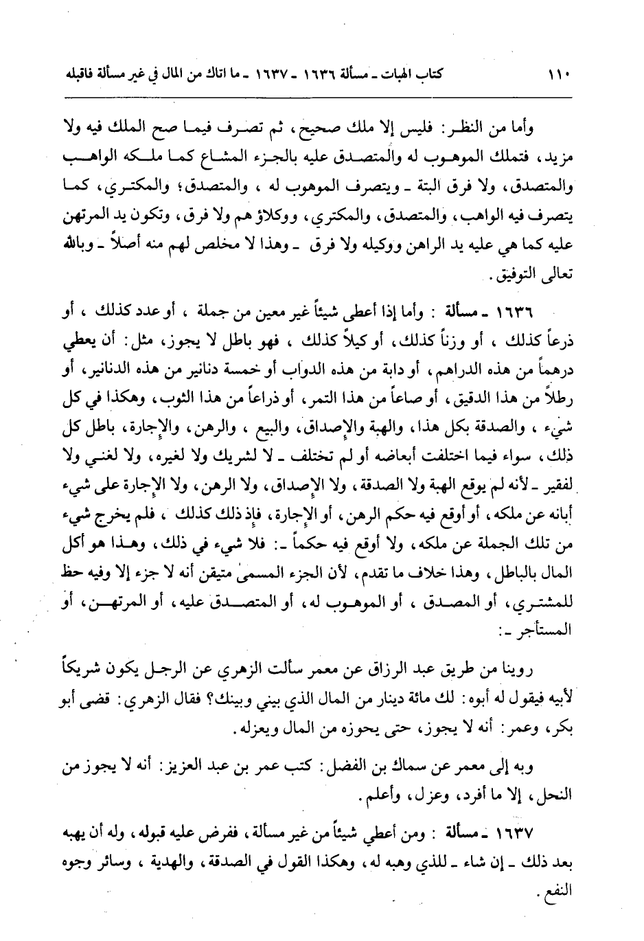 1636 - مَسْأَلَةٌ: وَأَمَّا إذَا أَعْطَى شَيْئًا غَيْرَ مُعَيَّنٍ مِنْ جُمْلَةٍ، أَوْ عَدَدًا كَذَلِكَ، أَوْ ذَرْعًا كَذَلِكَ، أَوْ وَزْنًا كَذَلِكَ، أَوْ كَيْلًا كَذَلِكَ، فَهُوَ بَاطِلٌ لَا يَجُوزُ، مِثْلُ: أَنْ يُعْطِيَ دِرْهَمًا مِنْ هَذِهِ الدَّرَاهِمِ، أَوْ دَابَّةً مِنْ هَذِهِ الدَّوَابِّ أَوْ خَمْسَةَ دَنَانِيرَ مِنْ هَذِهِ الدَّنَانِيرِ، أَوْ رِطْلًا مِنْ هَذَا الدَّقِيقِ، أَوْ صَاعًا مِنْ هَذَا التَّمْرِ، أَوْ ذِرَاعًا مِنْ هَذَا الثَّوْبِ، وَهَكَذَا فِي كُلِّ شَيْءٍ، وَالصَّدَقَةُ بِكُلِّ هَذَا، وَالْهِبَةُ وَالْإِصْدَاقُ، وَالْبَيْعُ، وَالرَّهْنُ، وَالْإِجَارَةُ، بَاطِلٌ كُلُّ ذَلِكَ سَوَاءٌ فِيمَا اخْتَلَفَتْ أَبْعَاضُهُ أَوْ لَمْ تَخْتَلِفْ - لَا لِشَرِيكٍ وَلَا لِغَيْرِهِ، وَلَا لِغَنِيٍّ وَلَا لِفَقِيرٍ - لِأَنَّهُ لَمْ يُوقِعْ الْهِبَةَ وَلَا الصَّدَقَةَ، وَلَا الْإِصْدَاقَ، وَلَا الرَّهْنَ، وَلَا الْإِجَارَةَ عَلَى شَيْءٍ أَبَانَهُ عَنْ مِلْكِهِ، أَوْ أَوْقَعَ فِيهِ حُكْمَ الرَّهْنِ، أَوْ الْإِجَارَةِ، فَإِذْ ذَلِكَ كَذَلِكَ، فَلَمْ يَخْرُجْ شَيْءٌ مِنْ تِلْكَ الْجُمْلَةِ عَنْ مِلْكِهِ، وَلَا أَوْقَعَ فِيهِ حُكْمًا -: فَلَا شَيْءَ فِي ذَلِكَ، وَهَذَا هُوَ أَكْلُ الْمَالِ بِالْبَاطِلِ، وَهَذَا خِلَافُ مَا تَقَدَّمَ؛ لِأَنَّ الْجُزْءَ الْمُسَمَّى مُتَيَقَّنٌ أَنَّهُ لَا جُزْءَ إلَّا وَفِيهِ حَظٌّ لِلْمُشْتَرِي، أَوْ الْمُصَدِّقِ، أَوْ الْمَوْهُوبِ لَهُ، أَوْ الْمُتَصَدَّقِ عَلَيْهِ، أَوْ الْمُرْتَهِنِ، أَوْ الْمُسْتَأْجِرِ -: رُوِّينَا مِنْ طَرِيقِ عَبْدِ الرَّزَّاقِ عَنْ مَعْمَرٍ سَأَلْت الزُّهْرِيَّ عَنْ الرَّجُلِ يَكُونُ شَرِيكًا لِأَبِيهِ فَيَقُولُ لَهُ أَبُوهُ: لَك مِائَةُ دِينَارٍ مِنْ الْمَالِ الَّذِي بَيْنِي وَبَيْنَك؟ فَقَالَ الزُّهْرِيُّ: قَضَى أَبُو بَكْرٍ، وَعُمَرُ: أَنَّهُ لَا يَجُوزُ، حَتَّى يَحُوزَهُ مِنْ الْمَالِ وَيَعْزِلَهُ.