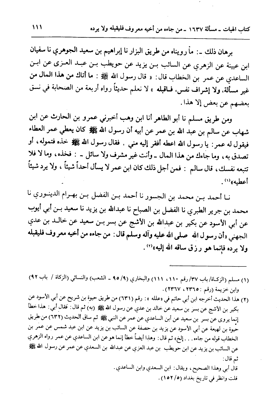 بُرْهَانُ ذَلِكَ -: مَا رُوِّينَاهُ مِنْ طَرِيقِ الْبَزَّارِ نَا إبْرَاهِيمُ بْنُ سَعِيدٍ الْجَوْهَرِيُّ نَا سُفْيَانُ بْنُ عُيَيْنَةَ عَنْ الزُّهْرِيِّ عَنْ السَّائِبِ بْنِ يَزِيدَ عَنْ حُوَيْطِبِ بْنِ عَبْدِ الْعُزَّى عَنْ ابْنِ السَّاعِدِيِّ عَنْ عُمَرَ بْنِ الْخَطَّابِ قَالَ: " قَالَ رَسُولُ اللَّهِ - صَلَّى اللَّهُ عَلَيْهِ وَسَلَّمَ -: «مَا أَتَاكَ مِنْ هَذَا الْمَالِ مِنْ غَيْرِ مَسْأَلَةٍ، وَلَا إشْرَافِ نَفْسٍ، فَاقْبَلْهُ» لَا نَعْلَمُ حَدِيثًا رَوَاهُ أَرْبَعَةٌ مِنْ الصَّحَابَةِ فِي نَسْقِ بَعْضِهِمْ عَنْ بَعْضٍ إلَّا هَذَا.