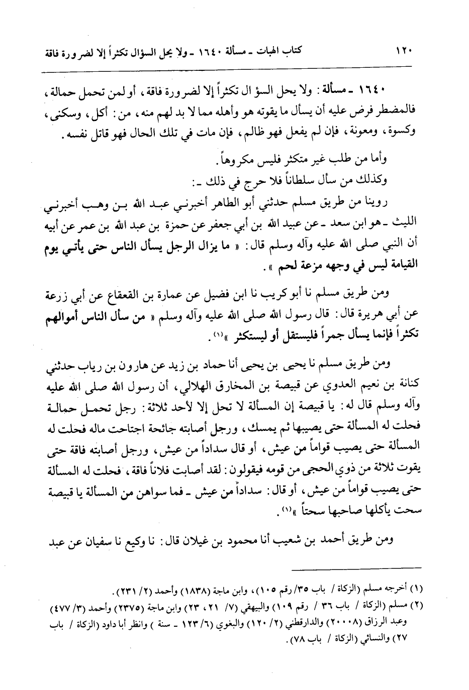 وَمِنْ طَرِيقِ مُسْلِمٍ نَا يَحْيَى بْنُ يَحْيَى نَا حَمَّادُ بْنُ زَيْدٍ عَنْ هَارُونَ بْنِ رِئَابٍ حَدَّثَنِي كِنَانَةُ بْنُ نُعَيْمٍ الْعَدَوِيُّ عَنْ قَبِيصَةَ بْنِ الْمُخَارِقِ الْهِلَالِيِّ، «أَنَّ رَسُولَ اللَّهِ - صَلَّى اللَّهُ عَلَيْهِ وَآلِهِ وَسَلَّمَ - قَالَ لَهُ: يَا قَبِيصَةُ إنَّ الْمَسْأَلَةَ لَا تَحِلُّ إلَّا لِأَحَدِ ثَلَاثَةٍ: رَجُلٌ تَحَمَّلَ حَمَالَةً فَحَلَّتْ لَهُ الْمَسْأَلَةُ حَتَّى يُصِيبَهَا ثُمَّ يُمْسِكَ، وَرَجُلٌ أَصَابَتْهُ جَائِحَةٌ اجْتَاحَتْ مَالَهُ فَحَلَّتْ لَهُ الْمَسْأَلَةُ حَتَّى يُصِيبَ قَوَامًا مِنْ عَيْشٍ، أَوْ قَالَ سَدَادًا مِنْ عَيْشٍ، وَرَجُلٌ أَصَابَتْهُ فَاقَةٌ حَتَّى يَقُوتَ ثَلَاثَةً مِنْ ذَوِي الْحَجِّ مِنْ قَوْمِهِ فَيَقُولُونَ: لَقَدْ أَصَابَتْ فُلَانًا فَاقَةٌ، فَحَلَّتْ لَهُ الْمَسْأَلَةُ حَتَّى يُصِيبَ قَوَامًا مِنْ عَيْشٍ، أَوْ قَالَ: سَدَادًا مِنْ عَيْشٍ - فَمَا سِوَاهُنَّ مِنْ الْمَسْأَلَةِ يَا قَبِيصَةُ سُحْتٌ يَأْكُلُهَا صَاحِبُهَا سُحْتًا» .