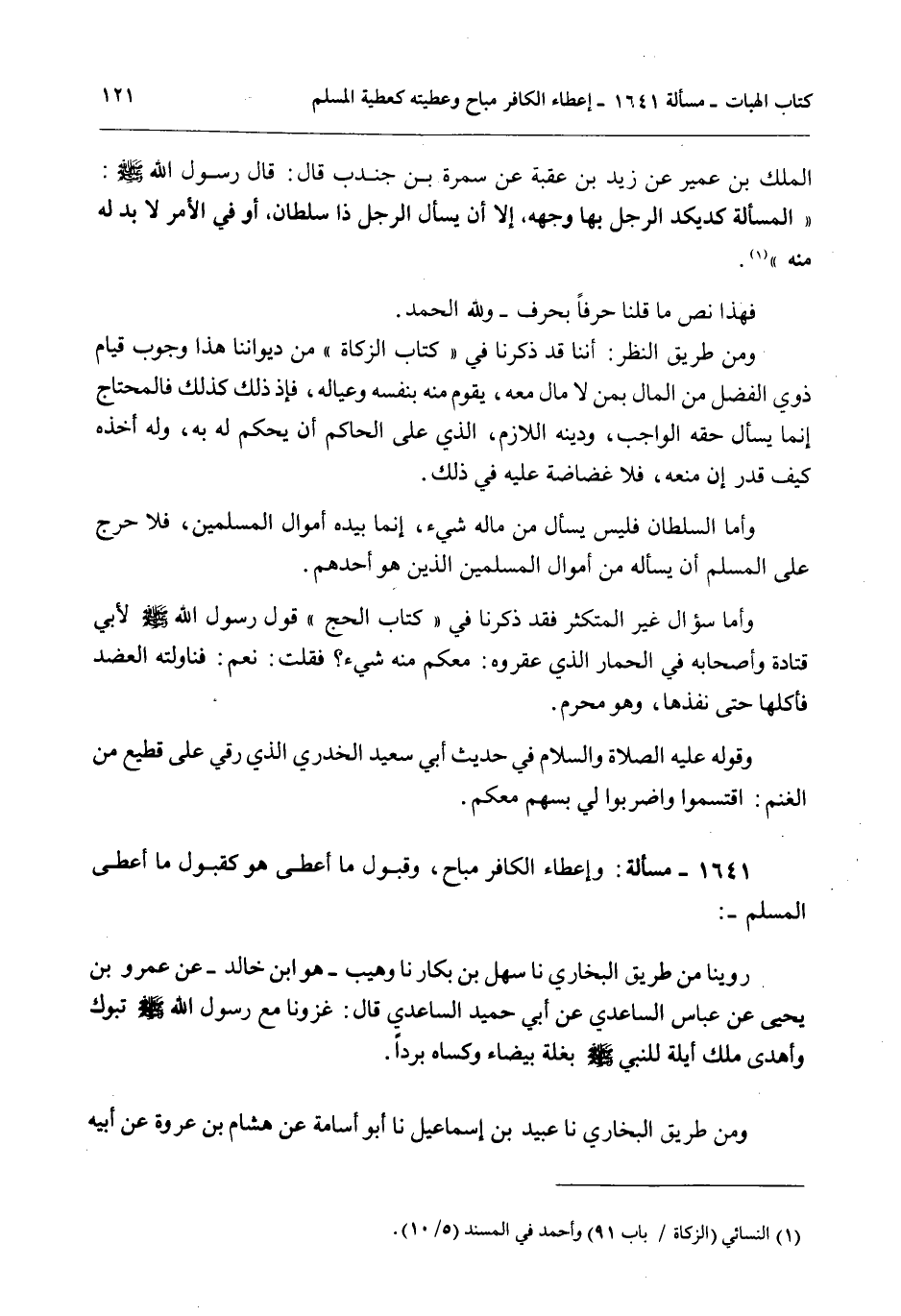 1641 - مَسْأَلَةٌ: وَإِعْطَاءُ الْكَافِرِ مُبَاحٌ، وَقَبُولُ مَا أَعْطَى هُوَ كَقَبُولِ مَا أَعْطَى الْمُسْلِمُ -: رُوِّينَا مِنْ طَرِيقِ الْبُخَارِيِّ نَا سَهْلُ بْنُ بَكَّارَ نَا وُهَيْبٍ - هُوَ ابْنُ خَالِدٍ - عَنْ عَمْرِو بْنِ يَحْيَى عَنْ عَبَّاسٍ السَّاعِدِيِّ عَنْ أَبِي حُمَيْدٍ السَّاعِدِيِّ قَالَ: «غَزَوْنَا مَعَ رَسُولِ اللَّهِ - صَلَّى اللَّهُ عَلَيْهِ وَسَلَّمَ - تَبُوكَ وَأَهْدَى مَلِكُ آيِلَةَ لِلنَّبِيِّ - صَلَّى اللَّهُ عَلَيْهِ وَسَلَّمَ - بَغْلَةً بَيْضَاءَ وَكَسَاهُ بُرْدًا» .