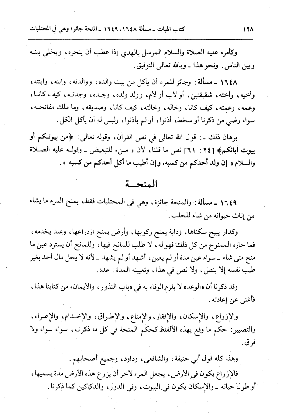 الْمِنْحَةُ 1649 - مَسْأَلَةٌ: وَالْمِنْحَةُ جَائِزَةٌ، وَهِيَ فِي الْمُحْتَلَبَاتِ فَقَطْ، يَمْنَحُ الْمَرْءُ مَا يَشَاءُ مِنْ إنَاثِ حَيَوَانِهِ مَنْ شَاءَ لِلْحَلْبِ.