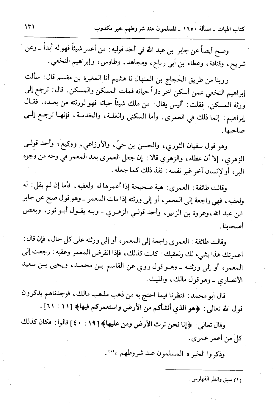 وَقَالَتْ طَائِفَةٌ: الْعُمْرَى: هِبَةٌ صَحِيحَةٌ إذَا أَعْمَرَهَا لَهُ وَلِعَقِبِهِ، فَأَمَّا إنْ لَمْ يَقُلْ: لَهُ وَلِعَقِبِهِ، فَهِيَ رَاجِعَةٌ إلَى الْمُعَمِّرِ، أَوْ إلَى وَرَثَتِهِ إذَا مَاتَ الْمُعَمِّرُ - وَهُوَ قَوْلٌ صَحَّ عَنْ جَابِرِ بْنِ عَبْدِ اللَّهِ، وَعُرْوَةَ بْنِ الزُّبَيْرِ، وَأَحَدُ قَوْلَيْ الزُّهْرِيِّ - وَبِهِ يَقُولُ أَبُو ثَوْرٍ، وَبَعْضُ أَصْحَابِنَا وَقَالَتْ طَائِفَةٌ: الْعُمْرَى رَاجِعَةٌ إلَى الْمُعَمِّرِ، أَوْ إلَى وَرَثَتِهِ عَلَى كُلِّ حَالٍ، فَإِنْ قَالَ: أَعْمَرْتُكَ هَذَا بِشَيْءٍ لَك وَلِعَقِبِك: كَانَتْ كَذَلِكَ، فَإِذَا انْقَرَضَ الْمُعَمِّرُ وَعَقِبُهُ: رَجَعَتْ إلَى الْمُعَمِّرِ، أَوْ إلَى وَرَثَتِهِ - وَهُوَ قَوْلٌ رُوِيَ عَنْ الْقَاسِمِ بْنِ مُحَمَّدٍ، وَيَحْيَى بْنِ سَعِيدٍ الْأَنْصَارِيِّ - وَهُوَ قَوْلُ مَالِكٍ، وَاللَّيْثِ قَالَ أَبُو مُحَمَّدٍ: فَنَظَرْنَا فِيمَا احْتَجَّ بِهِ مَنْ ذَهَبَ مَذْهَبَ مَالِكٍ، فَوَجَدْنَاهُمْ يَذْكُرُونَ قَوْلَ اللَّهِ تَعَالَى: {هُوَ أَنْشَأَكُمْ مِنَ الأَرْضِ وَاسْتَعْمَرَكُمْ فِيهَا} [هود: 61] وَقَالَ تَعَالَى: {إِنَّا نَحْنُ نَرِثُ الأَرْضَ وَمَنْ عَلَيْهَا} [مريم: 40] قَالُوا: فَكَانَ كَذَلِكَ كُلُّ مَنْ أُعْمِرَ عُمْرَى وَذَكَرُوا الْخَبَرَ «الْمُسْلِمُونَ عِنْدَ شُرُوطِهِمْ»