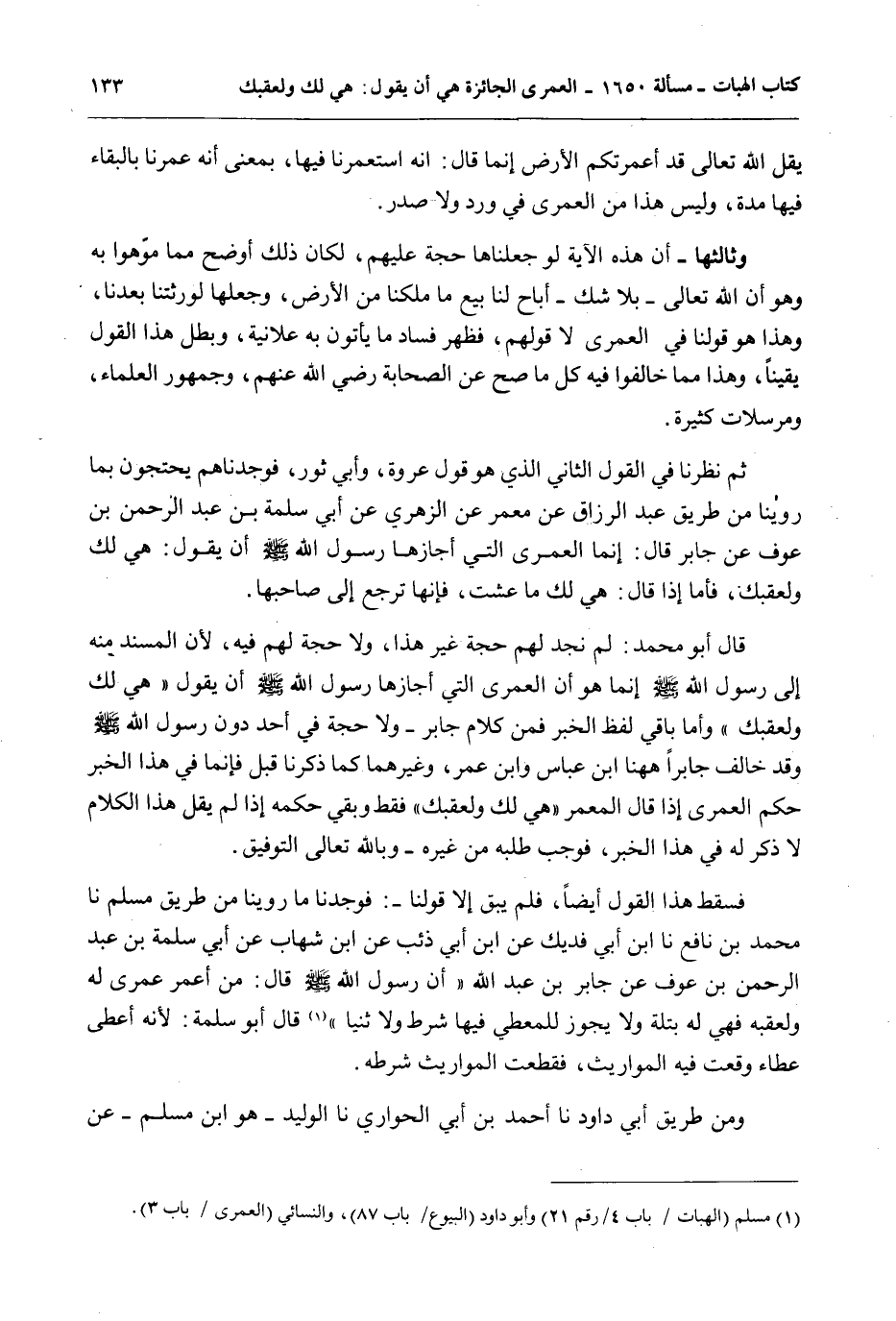 فَسَقَطَ هَذَا الْقَوْلُ أَيْضًا، فَلَمْ يَبْقَ إلَّا قَوْلُنَا -: فَوَجَدْنَا مَا رُوِّينَا مِنْ طَرِيقِ مُسْلِمٍ نا مُحَمَّدُ بْنُ نَافِعٍ نَا ابْنُ أَبِي فُدَيْكٍ عَنْ ابْنِ أَبِي ذِئْبٍ عَنْ ابْنِ شِهَابٍ عَنْ أَبِي سَلَمَةَ بْنِ عَبْدِ الرَّحْمَنِ بْنِ عَوْفٍ عَنْ جَابِرِ بْنِ عَبْدِ اللَّهِ " أَنَّ رَسُولَ اللَّهِ - صَلَّى اللَّهُ عَلَيْهِ وَسَلَّمَ - قَالَ: «مَنْ أُعْمِرَ عُمْرَى لَهُ وَلِعَقِبِهِ فَهِيَ لَهُ بَتْلَةٌ وَلَا يَجُوزُ لِلْمُعْطِي فِيهَا شَرْطٌ وَلَا ثُنْيَا» قَالَ أَبُو سَلَمَةَ: لِأَنَّهُ أَعْطَى عَطَاءً وَقَعَتْ فِيهِ الْمَوَارِيثُ، فَقَطَعَتْ الْمَوَارِيثُ شَرْطَهُ. وَمِنْ طَرِيقِ أَبِي دَاوُد نا أَحْمَدُ بْنُ أَبِي الْحَوَارِيُّ نا الْوَلِيدُ - هُوَ ابْنُ مُسْلِمٍ - عَنْ