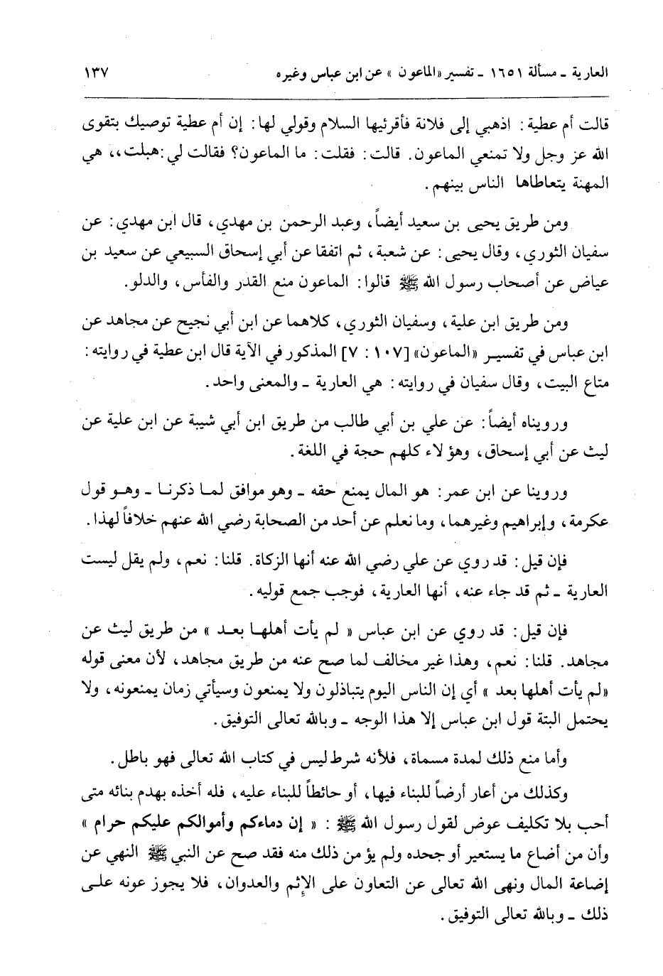 وَمِنْ طَرِيقِ ابْنِ عُلَيَّةَ، وَسُفْيَانَ الثَّوْرِيِّ، كِلَاهُمَا عَنْ ابْنِ أَبِي نَجِيحٍ عَنْ مُجَاهِدٍ عَنْ ابْنِ عَبَّاسٍ فِي تَفْسِيرِ {الْمَاعُونَ} [الماعون: 7] الْمَذْكُورِ فِي الْآيَةِ قَالَ ابْنُ عَطِيَّةَ فِي رِوَايَتِهِ: مَتَاعُ الْبَيْتِ، وَقَالَ سُفْيَانُ فِي رِوَايَتِهِ: هِيَ الْعَارِيَّةُ - وَالْمَعْنَى وَاحِدٌ.