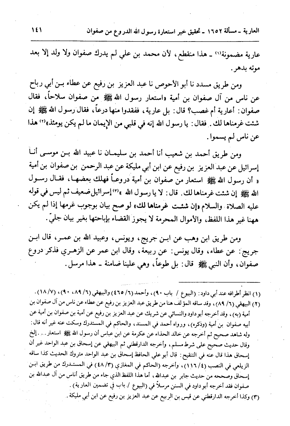 وَمِنْ طَرِيقِ مُسَدَّدٍ نا أَبُو الْأَحْوَصِ نا عَبْدُ الْعَزِيزِ بْنُ رُفَيْعٍ عَنْ عَطَاءِ بْنِ أَبِي رَبَاحٍ عَنْ نَاسٍ مِنْ آلِ صَفْوَانَ بْنِ أُمَيَّةَ «اسْتَعَارَ رَسُولُ اللَّهِ - صَلَّى اللَّهُ عَلَيْهِ وَسَلَّمَ - مِنْ صَفْوَانَ سِلَاحًا، فَقَالَ صَفْوَانُ: أَعَارِيَّةٌ أَمْ غَصْبٌ؟ قَالَ: بَلْ عَارِيَّةٌ، فَفَقَدُوا مِنْهَا دِرْعًا، فَقَالَ رَسُولُ اللَّهِ - صَلَّى اللَّهُ عَلَيْهِ وَسَلَّمَ - إنْ شِئْت غَرِمْنَاهَا لَكَ فَقَالَ: يَا رَسُولَ اللَّهِ إنَّهُ فِي قَلْبِي مِنْ الْإِيمَانِ مَا لَمْ يَكُنْ يَوْمَئِذٍ»