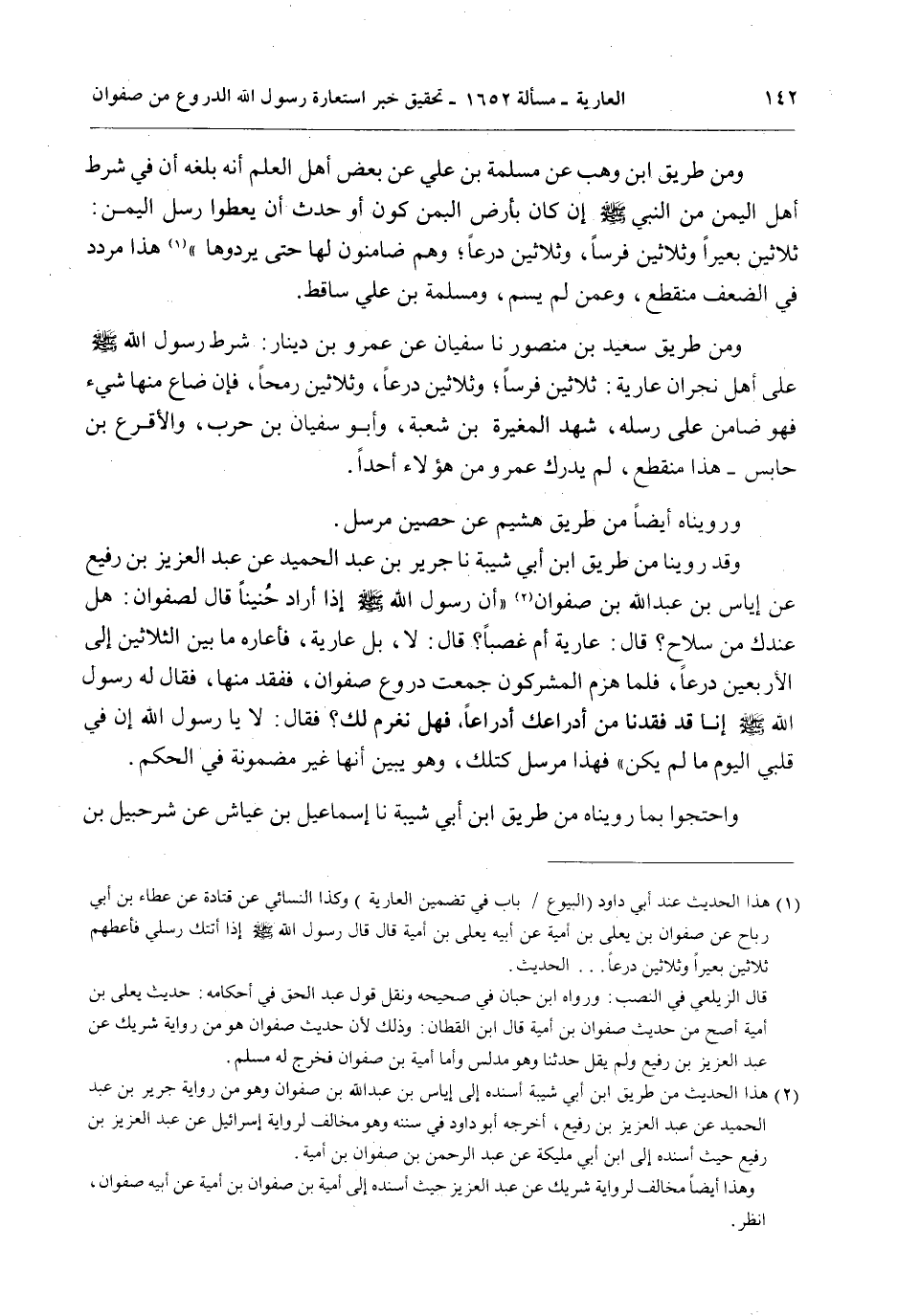 وَمِنْ طَرِيقِ ابْنِ وَهْبٍ عَنْ مَسْلَمَةَ بْنِ عَلِيٍّ عَنْ بَعْضِ أَهْلِ الْعِلْمِ أَنَّهُ بَلَغَهُ «أَنَّ فِي شَرْطِ أَهْلِ الْيَمَنِ مِنْ النَّبِيِّ - صَلَّى اللَّهُ عَلَيْهِ وَسَلَّمَ - إنْ كَانَ بِأَرْضِ الْيَمَنِ كَوْنٌ أَوْ حَدَثٌ أَنْ يُعْطُوا رُسُلَ الْيَمَنِ: ثَلَاثِينَ بَعِيرًا وَثَلَاثِينَ فَرَسًا، وَثَلَاثِينَ دِرْعًا؛ وَهُمْ ضَامِنُونَ لَهَا حَتَّى يَرُدُّوهَا» هَذَا مُرَدَّدٌ فِي الضَّعْفِ مُنْقَطِعٌ، وَعَمَّنْ لَمْ يُسَمَّ، وَمَسْلَمَةُ بْنُ عَلِيٍّ سَاقِطٌ. وَمِنْ طَرِيقِ سَعِيدِ بْنِ مَنْصُورٍ نا سُفْيَانُ عَنْ عَمْرِو بْنِ دِينَارٍ: «شَرَطَ رَسُولُ اللَّهِ - صَلَّى اللَّهُ عَلَيْهِ وَسَلَّمَ - عَلَى أَهْلِ نَجْرَانَ عَارِيَّةً: ثَلَاثِينَ فَرَسًا، وَثَلَاثِينَ دِرْعًا، وَثَلَاثِينَ رُمْحًا، فَإِنْ ضَاعَ مِنْهَا شَيْءٌ فَهُوَ ضَامِنٌ عَلَى رُسُلِهِ» ، شَهِدَ الْمُغِيرَةُ بْنُ شُعْبَةَ، وَأَبُو سُفْيَانَ بْنُ حَرْبٍ، وَالْأَقْرَعُ بْنُ حَابِسٍ - هَذَا مُنْقَطِعٌ، لَمْ يُدْرِكْ عَمْرٌو مِنْ هَؤُلَاءِ أَحَدًا وَرُوِّينَاهُ أَيْضًا مِنْ طَرِيقِ هُشَيْمٍ عَنْ حُصَيْنٍ مُرْسَلٌ.