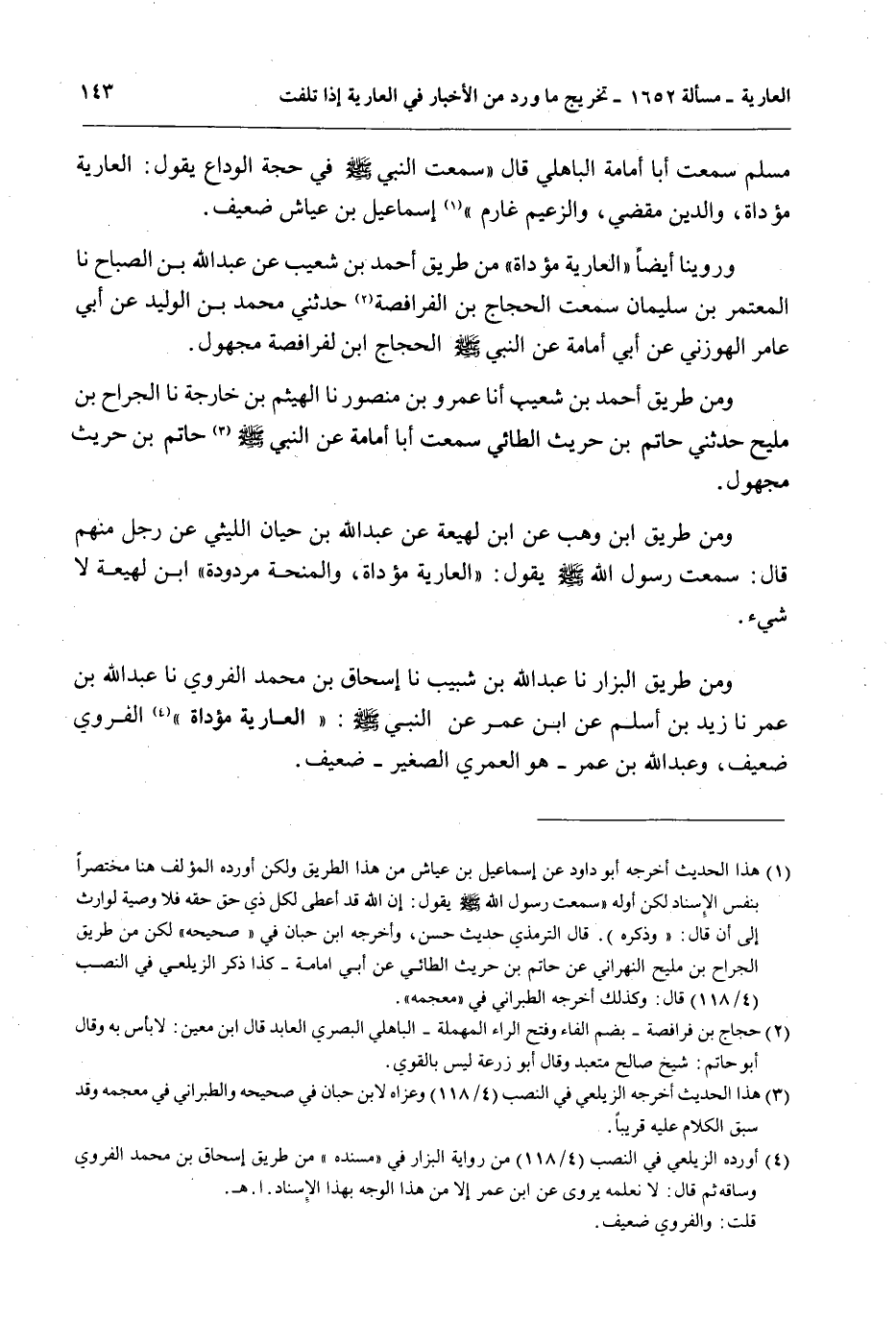 وَرُوِّينَا أَيْضًا «الْعَارِيَّةُ مُؤَدَّاةٌ» مِنْ طَرِيقِ أَحْمَدَ بْنِ شُعَيْبٍ عَنْ عَبْدِ اللَّهِ بْنِ الصَّبَّاحِ نا الْمُعْتَمِرُ بْنُ سُلَيْمَانَ سَمِعْت الْحَجَّاجَ بْنَ الْفُرَافِصَةِ حَدَّثَنِي مُحَمَّدُ بْنُ الْوَلِيدِ عَنْ أَبِي عَامِرٍ الْهَوْزَنِيِّ عَنْ أَبِي أُمَامَةَ عَنْ النَّبِيِّ - صَلَّى اللَّهُ عَلَيْهِ وَسَلَّمَ - الْحَجَّاجُ بْنُ الْفُرَافِصَةِ مَجْهُولٌ.
