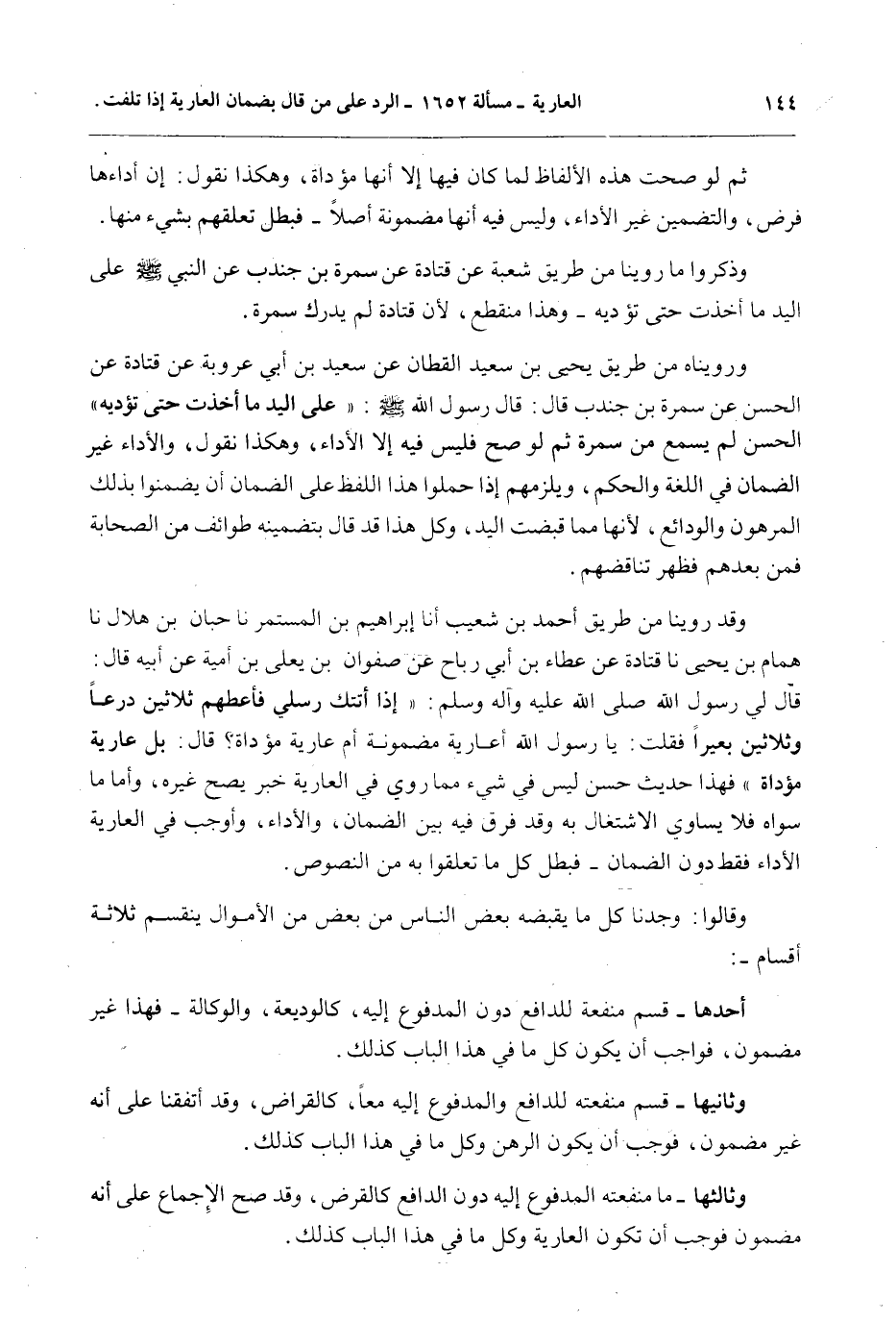 وَقَدْ رُوِّينَا مِنْ طَرِيقِ أَحْمَدَ بْنِ شُعَيْبٍ نا إبْرَاهِيمُ بْنُ الْمُسْتَمِرِّ نا حِبَّانُ بْنُ هِلَالٍ نا هَمَّامُ بْنُ يَحْيَى نا قَتَادَةُ عَنْ عَطَاءِ بْنِ أَبِي رَبَاحٍ عَنْ صَفْوَانَ بْنِ يَعْلَى بْنِ أُمَيَّةَ عَنْ أَبِيهِ قَالَ: قَالَ لِي رَسُولُ اللَّهِ - صَلَّى اللَّهُ عَلَيْهِ وَآلِهِ وَسَلَّمَ -: «إذَا أَتَتْكَ رُسُلِي فَأَعْطِهِمْ ثَلَاثِينَ دِرْعًا وَثَلَاثِينَ بَعِيرًا فَقُلْتُ: يَا رَسُولَ اللَّهِ أَعَارِيَّةٌ مَضْمُونَةٌ أَمْ عَارِيَّةٌ مُؤَدَّاةٌ؟ قَالَ: بَلْ عَارِيَّةٌ مُؤَدَّاةٌ» فَهَذَا حَدِيثٌ حَسَنٌ لَيْسَ فِي شَيْءٍ مِمَّا رُوِيَ فِي الْعَارِيَّةِ خَبَرٌ يَصِحُّ غَيْرُهُ، وَأَمَّا مَا سِوَاهُ فَلَا يُسَاوِي الِاشْتِغَالَ بِهِ وَقَدْ فَرَّقَ فِيهِ بَيْنَ الضَّمَانِ، وَالْأَدَاءِ، وَأَوْجَبَ فِي الْعَارِيَّةِ الْأَدَاءَ فَقَطْ دُونَ الضَّمَانِ - فَبَطَلَ كُلُّ مَا تَعَلَّقُوا بِهِ مِنْ النُّصُوصِ.