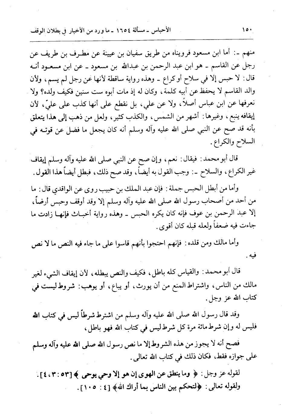 قَالَ أَبُو مُحَمَّدٍ: وَالْقِيَاسُ كُلُّهُ بَاطِلٌ، فَكَيْفَ وَالنَّصُّ يُبْطِلُهُ؛ لِأَنَّ إيقَافَ الشَّيْءِ لِغَيْرِ مَالِكٍ مِنْ النَّاسِ، وَاشْتِرَاطُ الْمَنْعِ مِنْ أَنْ يُورَثَ، أَوْ يُبَاعَ، أَوْ يُوهَبَ: شُرُوطٌ لَيْسَتْ فِي كِتَابِ اللَّهِ عَزَّ وَجَلَّ.