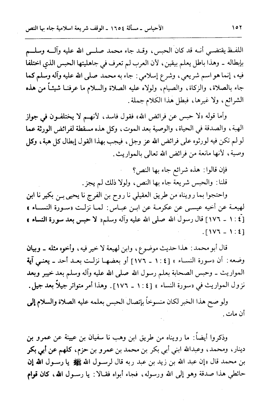 وَاحْتَجُّوا بِمَا رُوِّينَاهُ مِنْ طَرِيقِ الْعُقَيْلِيِّ نا رَوْحُ بْنُ الْفَرَجِ نا يَحْيَى بْنُ بُكَيْرٍ نا ابْنُ لَهِيعَةَ عَنْ أَخِيهِ عِيسَى عَنْ عِكْرِمَةَ عَنْ ابْنِ عَبَّاسٍ: «لَمَّا نَزَلَتْ سُورَةُ النِّسَاءِ قَالَ رَسُولُ اللَّهِ - صَلَّى اللَّهُ عَلَيْهِ وَآلِهِ وَسَلَّمَ - لَا حَبْسَ بَعْدَ سُورَةِ النِّسَاءِ» .