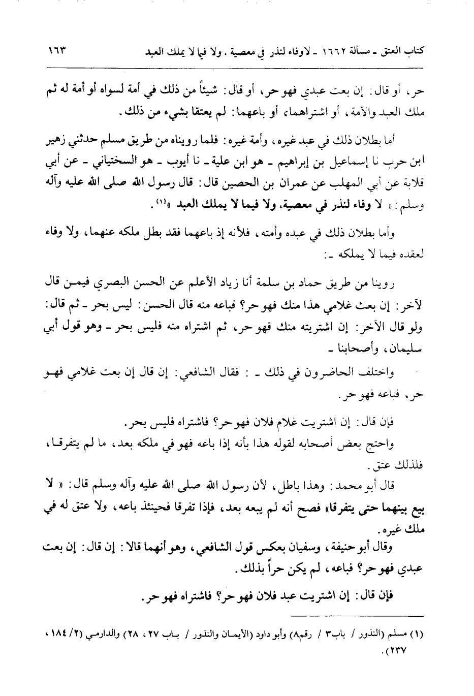 أَمَّا بُطْلَانُ ذَلِكَ فِي عَبْدِ غَيْرِهِ، وَأَمَةِ غَيْرِهِ: فَلِمَا رُوِّينَاهُ مِنْ طَرِيقِ مُسْلِمٍ حَدَّثَنِي زُهَيْرُ بْنُ حَرْبٍ نا إسْمَاعِيلُ بْنُ إبْرَاهِيمَ - هُوَ ابْنُ عُلَيَّةَ - نا أَيُّوبُ - هُوَ السِّخْتِيَانِيُّ - عَنْ أَبِي قِلَابَةَ عَنْ أَبِي الْمُهَلَّبِ عَنْ عِمْرَانَ بْنِ الْحُصَيْنِ قَالَ: قَالَ رَسُولُ اللَّهِ - صَلَّى اللَّهُ عَلَيْهِ وَآلِهِ وَسَلَّمَ -: «لَا وَفَاءَ لِنَذْرٍ فِي مَعْصِيَةٍ، وَلَا فِيمَا لَا يَمْلِكُ الْعَبْدُ» .