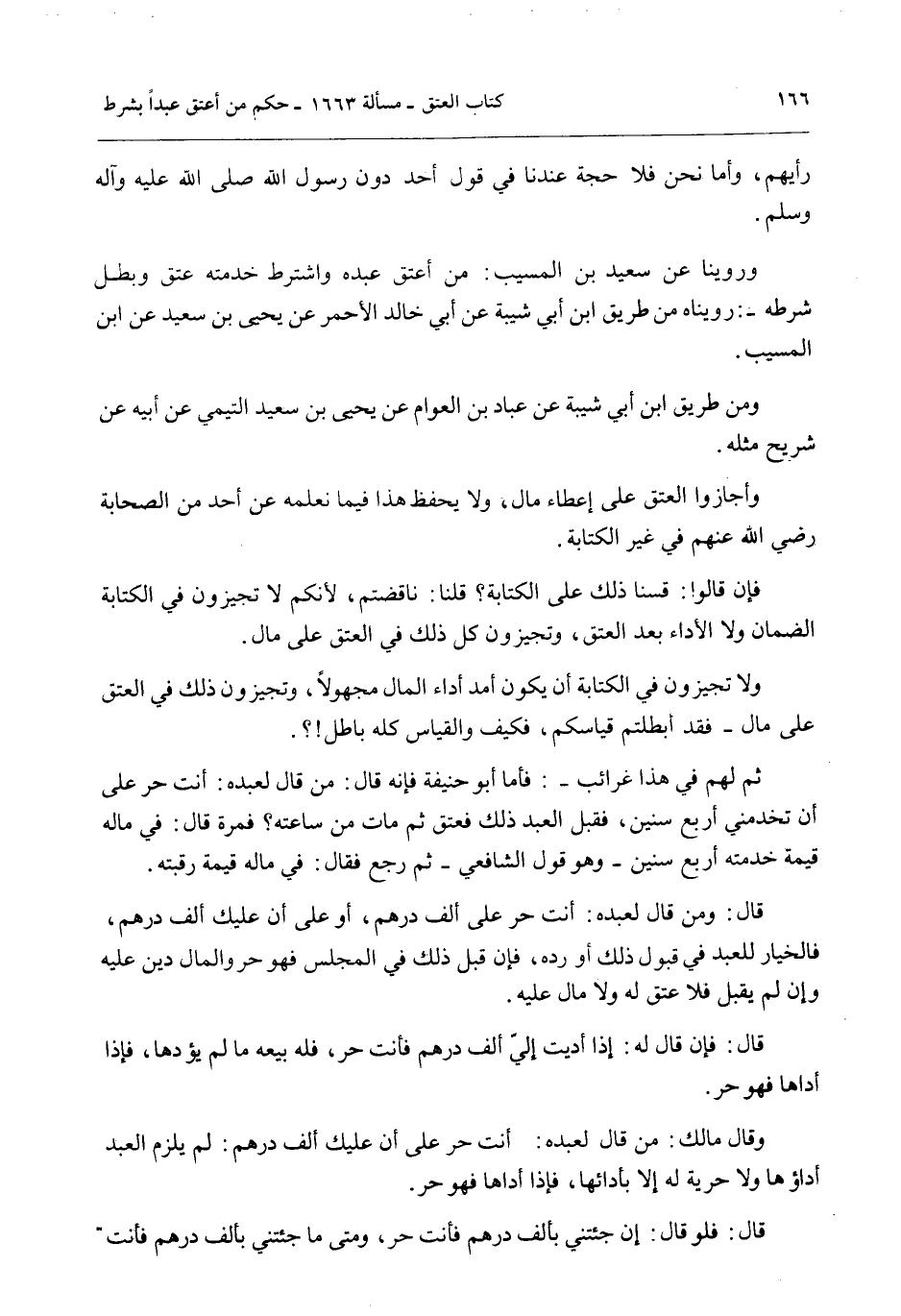 وَرُوِّينَا عَنْ سَعِيدِ بْنِ الْمُسَيِّبِ: مَنْ أَعْتَقَ عَبْدَهُ وَاشْتَرَطَ خِدْمَتَهُ عَتَقَ وَبَطَلَ شَرْطُهُ -: رُوِّينَاهُ مِنْ طَرِيقِ ابْنِ أَبِي شَيْبَةَ عَنْ أَبِي خَالِدٍ الْأَحْمَرَ عَنْ يَحْيَى بْنِ سَعِيدٍ عَنْ ابْنِ الْمُسَيِّبِ.