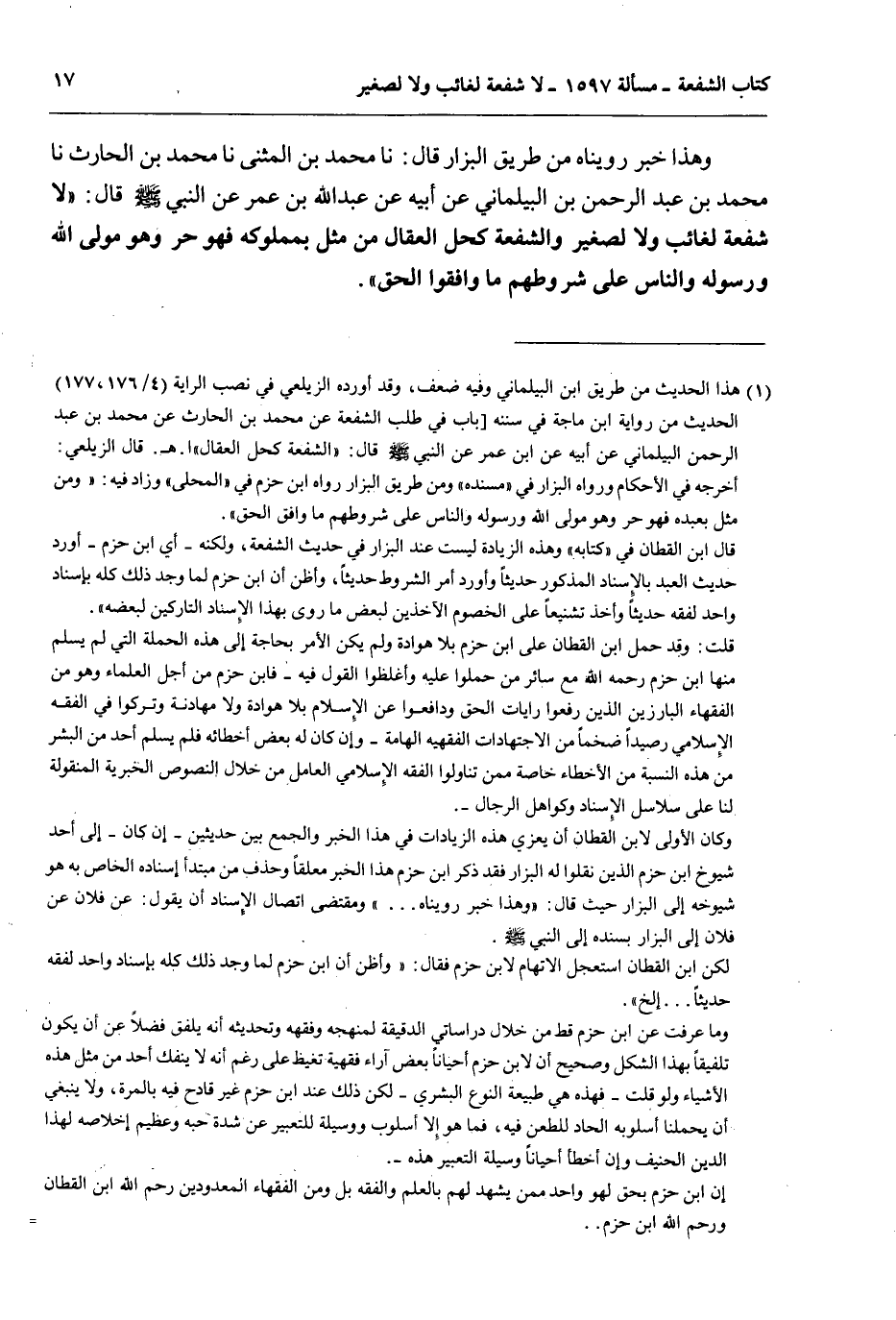 وَهَذَا خَبَرٌ رُوِّينَاهُ مِنْ طَرِيقِ الْبَزَّارِ قَالَ: أَنَا مُحَمَّدُ بْنُ الْمُثَنَّى أَنَا مُحَمَّدُ بْنُ الْحَارِثِ أَنَا مُحَمَّدُ بْنُ عَبْدِ الرَّحْمَنِ بْنِ الْبَيْلَمَانِيِّ عَنْ أَبِيهِ عَنْ عَبْدِ اللَّهِ بْنِ عُمَرَ عَنْ النَّبِيِّ - صَلَّى اللَّهُ عَلَيْهِ وَسَلَّمَ - قَالَ: «لَا شُفْعَةَ لِغَائِبٍ وَلَا لِصَغِيرٍ وَالشُّفْعَةُ كَحَلِّ الْعِقَالِ مَنْ مَثَّلَ بِمَمْلُوكِهِ فَهُوَ حُرٌّ وَهُوَ مَوْلَى اللَّهِ وَرَسُولِهِ وَالنَّاسُ عَلَى شُرُوطِهِمْ مَا وَافَقُوا الْحَقَّ.»
