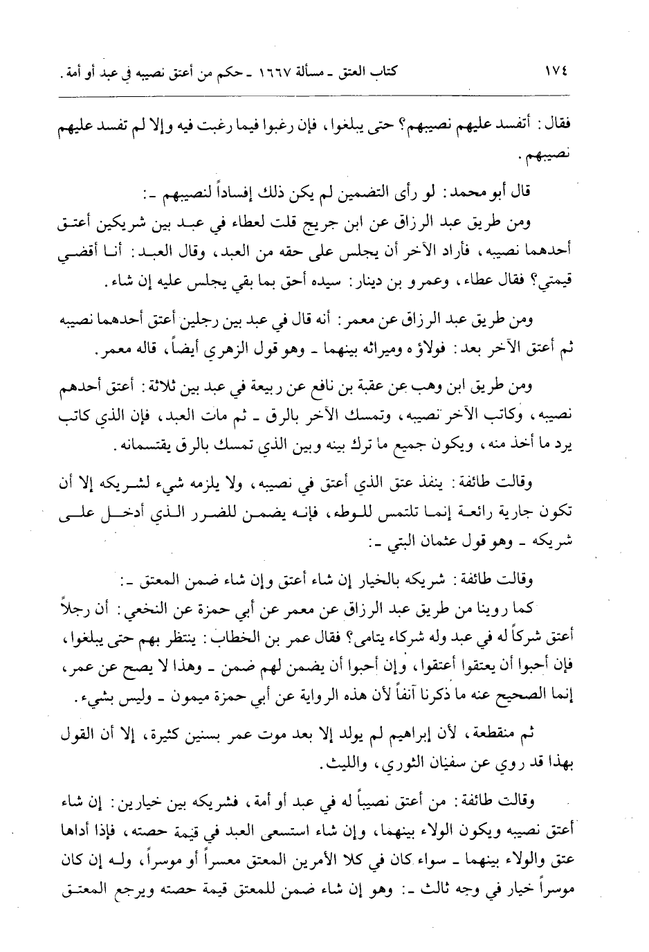قَالَ أَبُو مُحَمَّدٍ: لَوْ رَأَى التَّضْمِينَ لَمْ يَكُنْ ذَلِكَ إفْسَادًا لِنَصِيبِهِمْ -: وَمِنْ طَرِيقِ عَبْدِ الرَّزَّاقِ عَنْ ابْنِ جُرَيْجٍ قُلْت لِعَطَاءٍ فِي عَبْدٍ بَيْنَ شَرِيكَيْنِ أَعْتَقَ أَحَدُهُمَا نَصِيبَهُ، فَأَرَادَ الْآخَرُ أَنْ يَجْلِسَ عَلَى حَقِّهِ مِنْ الْعَبْدِ، وَقَالَ الْعَبْدُ: نا أَقْضِي قِيمَتِي فَقَالَ عَطَاءٌ، وَعَمْرُو بْنُ دِينَارٍ: سَيِّدُهُ أَحَقُّ بِمَا بَقِيَ يَجْلِسُ عَلَيْهِ إنْ شَاءَ