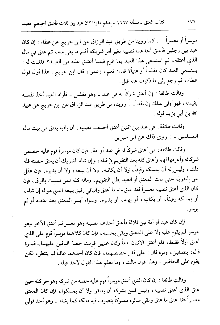 مُوسِرًا أَوْ مُعْسِرًا -: كَمَا رُوِّينَا مِنْ طَرِيقِ عَبْدِ الرَّزَّاقِ عَنْ ابْنِ جُرَيْجٍ عَنْ عَطَاءٍ: إنْ كَانَ عَبْدٌ بَيْنَ رَجُلَيْنِ فَأَعْتَقَ أَحَدُهُمَا نَصِيبَهُ بِغَيْرِ أَمْرِ شَرِيكِهِ أُقِيمَ مَا بَقِيَ مِنْهُ، ثُمَّ عَتَقَ فِي مَالِ الَّذِي أَعْتَقَهُ، ثُمَّ اسْتَسْعَى هَذَا الْعَبْدُ بِمَا غَرِمَ فِيمَا أَعْتَقَ عَلَيْهِ مِنْ الْعَبْدِ فَقُلْت لَهُ: يَسْتَسْعِي الْعَبْدُ كَانَ مُفْلِسًا أَوْ غَنِيًّا؟ قَالَ: نَعَمْ، زَعَمُوا.