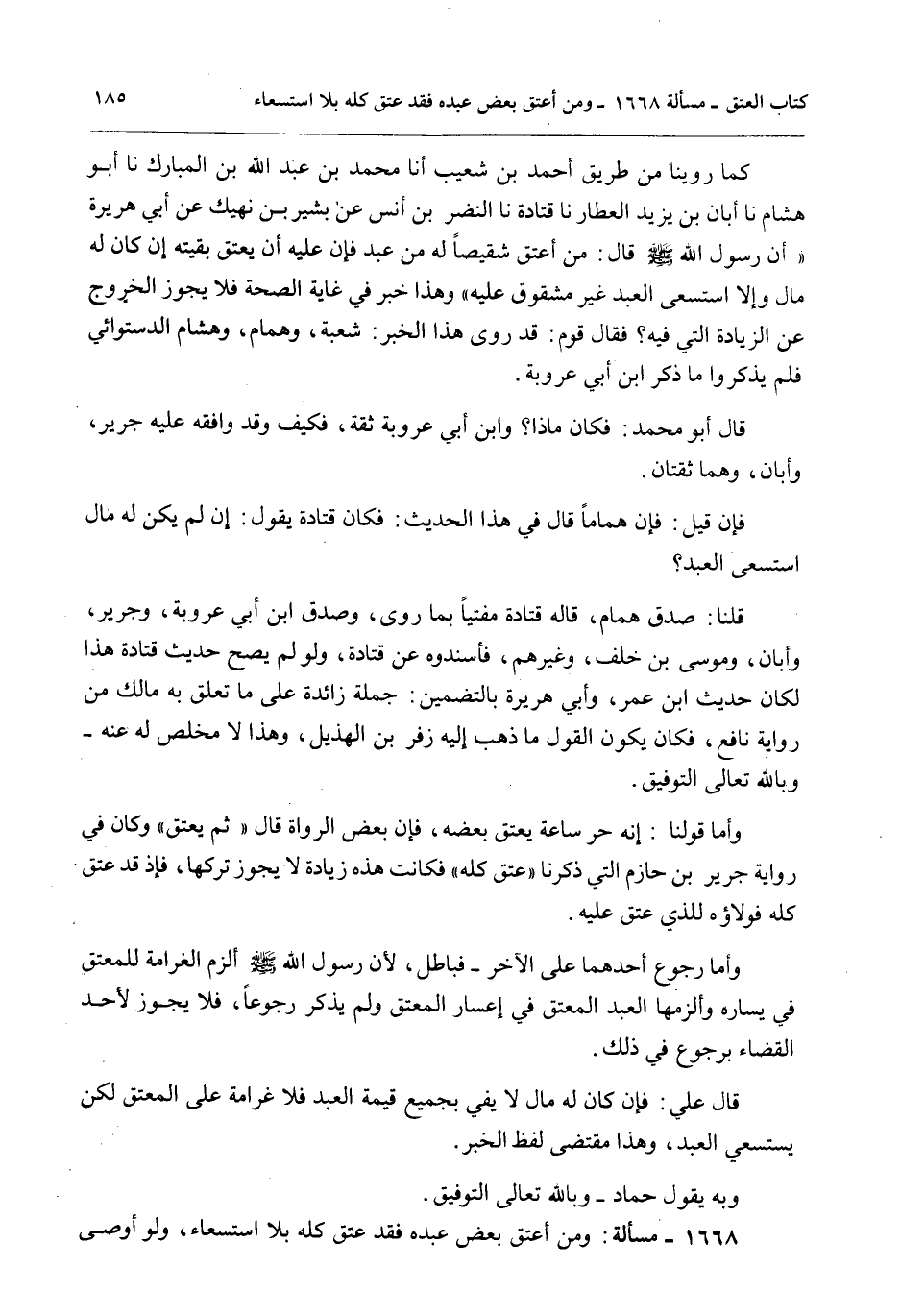 كَمَا رُوِّينَا مِنْ طَرِيق أَحْمَدَ بْنِ شُعَيْبٍ نا مُحَمَّدُ بْنُ عَبْدِ اللَّهِ بْنِ الْمُبَارَكِ نا أَبُو هِشَامٍ نا أَبَانُ بْنُ يَزِيدَ الْعَطَّارُ نا قَتَادَةُ نا النَّضْرُ بْنُ أَنَسٍ عَنْ بَشِيرِ بْنِ نَهِيكٍ عَنْ أَبِي هُرَيْرَةَ " أَنَّ رَسُولَ اللَّهِ - صَلَّى اللَّهُ عَلَيْهِ وَسَلَّمَ - قَالَ: «مَنْ أَعْتَقَ شَقِيصًا لَهُ مِنْ عَبْدٍ فَإِنَّ عَلَيْهِ أَنْ يُعْتِقَ بَقِيَّتَهُ إنْ كَانَ لَهُ مَالٌ وَإِلَّا اُسْتُسْعِيَ الْعَبْدُ غَيْرَ مَشْقُوقٍ عَلَيْهِ» وَهَذَا خَبَرٌ فِي غَايَةِ الصِّحَّةِ فَلَا يَجُوزُ الْخُرُوجُ عَنْ الزِّيَادَةِ الَّتِي فِيهِ؟ فَقَالَ قَوْمٌ: قَدْ رَوَى هَذَا الْخَبَرُ: شُعْبَةُ، وَهَمَّامٌ، وَهِشَامٌ الدَّسْتُوَائِيُّ فَلَمْ يَذْكُرُوا مَا ذَكَرَ ابْنُ أَبِي عَرُوبَةَ.