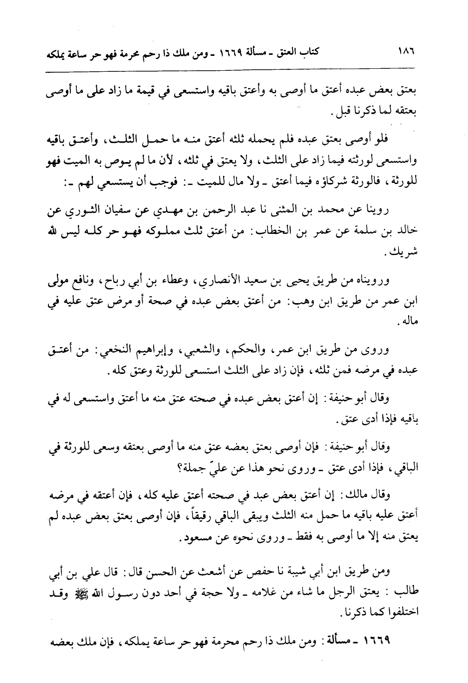 1669 - مَسْأَلَةٌ: وَمَنْ مَلَكَ ذَا رَحِمٍ مَحْرَمَةٍ فَهُوَ حُرٌّ سَاعَةَ يَمْلِكُهُ، فَإِنْ مَلَكَ بَعْضَهُ